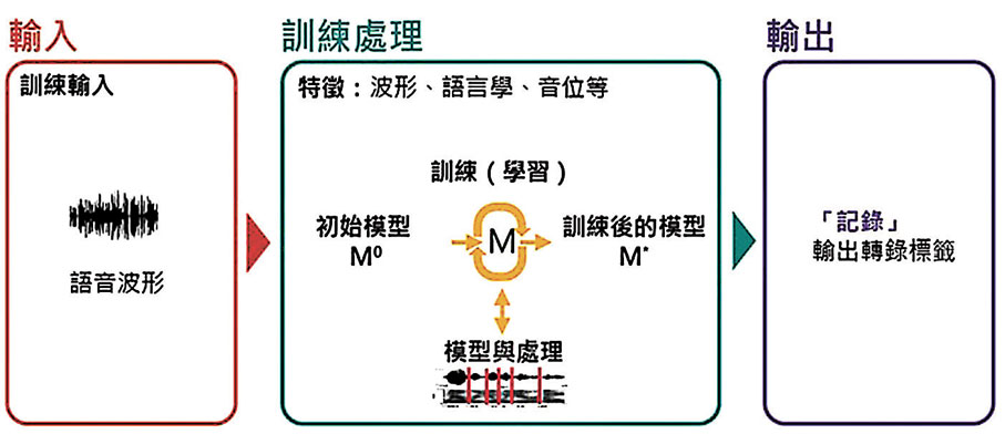 這項技術,涉及模型訓練和測試兩個過程,可以概括為「輸入—處理—輸出」的步驟。輸入語音後,ASR系統會提取特徵,然後放進模型內訓練和配對,最後再由系統輸出轉錄標籤。ASR系統的準確度,取決於用來訓練模型的數據量,因此系統需要大量訓練數據,才能製作出優質的模型。當模型訓練完成後,用戶可以透過語音測試模型,而經過訓練的語音識別器,便能準確地闡釋輸入語音,然後輸出轉錄標籤。