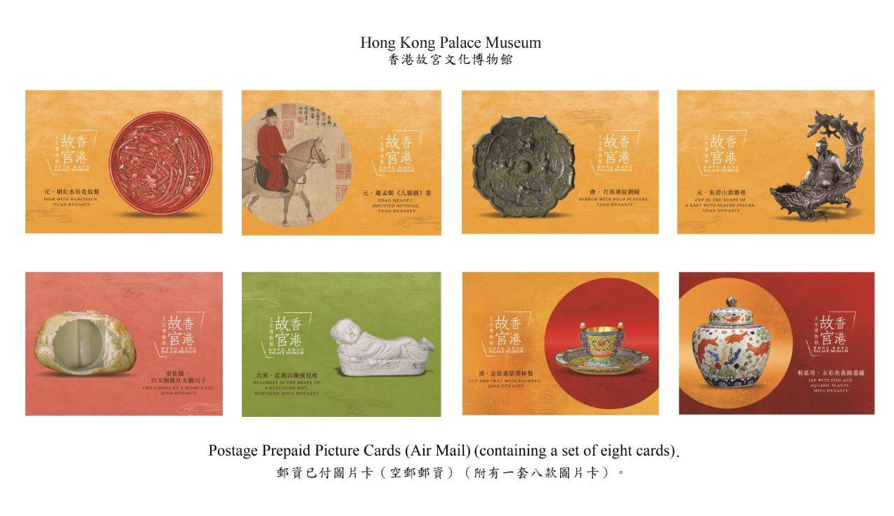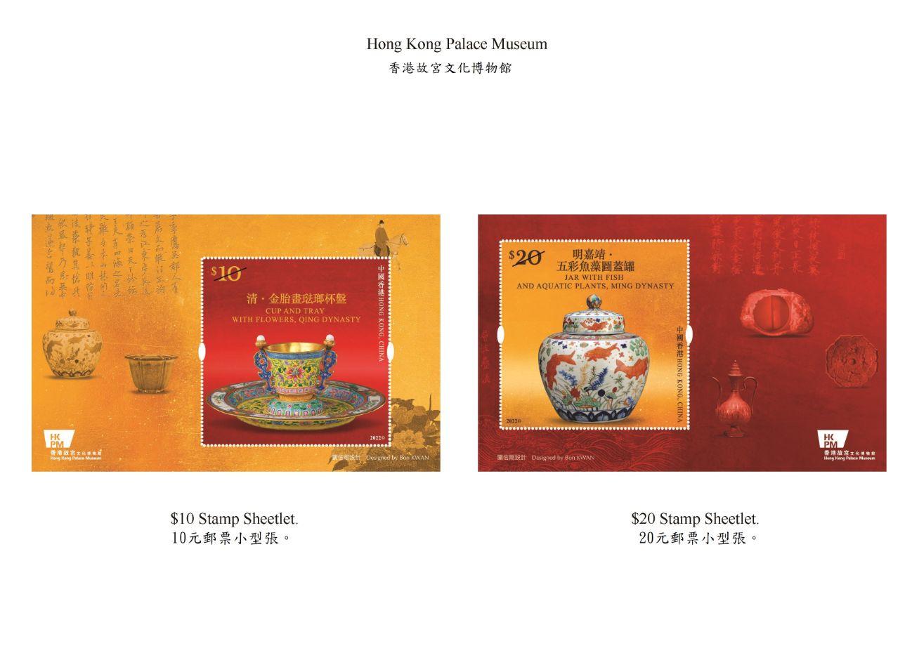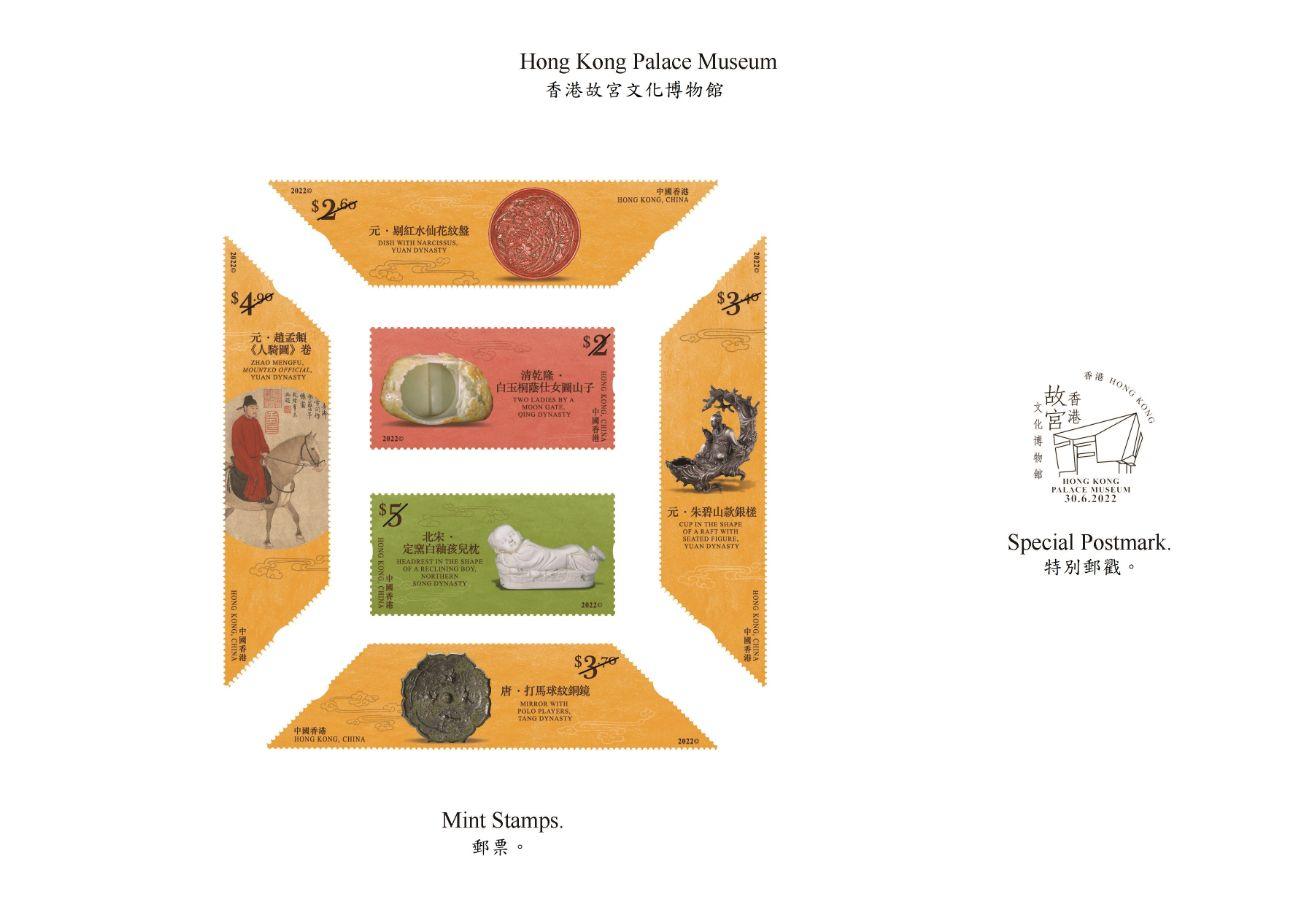 是次發行的一套六枚郵票,以「天圓地方」為基礎設計概念,每枚郵票分別以幾何圖案展示藏品,當中包括「清乾隆·白玉桐蔭仕女圖山子」、「元·剔紅水仙花紋盤」、「元·朱碧山款銀槎」、「唐·打馬球紋銅鏡」、「元·趙孟頫《人騎圖》卷」及「北宋·定窯白釉孩兒枕」,而六枚郵票亦巧妙地組合成一個正方形。郵票小型張則分別展示「清·金胎畫琺瑯杯盤」及「明嘉靖·五彩魚藻圖蓋罐」,並以金黃色及朱紅色互相襯托。金黃色凸顯故宮的尊榮及輝煌歷史,朱紅色則代表了故宮的紅牆,令郵品意涵豐富,更具收藏價值。