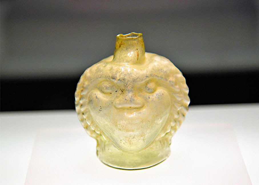 吹製玻璃技術的成熟使製作擬形玻璃器成為可能,特別是古羅馬人熱愛飲酒,酒神崇拜盛行,葡萄形玻璃器既象徵着果實纍纍的大豐收,也體現了對葡萄酒神狄奧尼索斯的信仰。展覽展出的玻璃「葡萄形瓶」和「椰棗形瓶」,便是典型的代表器物。此外,人面裝飾的玻璃器皿,以及雙耳瓶的多把手設計,則體現了玻璃吹製技術高度發達後玻璃工匠的炫技和創意。
