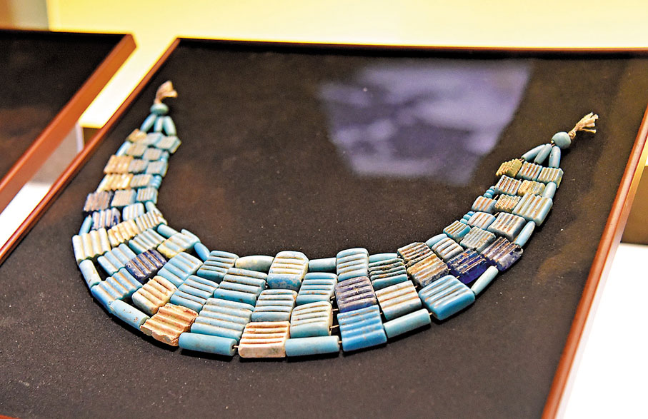 在第一單元「玻璃藝術的形成與發展」中,一件來自美索不達米亞地區的玻璃項鏈引人關注。這條項鏈以淡藍色為主基調,由六七十塊橫紋方形玻璃塊和空心圓體玻璃串聯而成,不同的顏色和組合,既簡潔美觀,又不失尊貴高雅。據悉,早期的玻璃由砂石和鹼性物質(草木灰等)製成,由於熔製溫度較低,同時多模仿青金石與綠松石的顏色,也讓這一時期的玻璃呈現出不透明的深藍色或天藍色,多用於製作配飾及小型器皿。