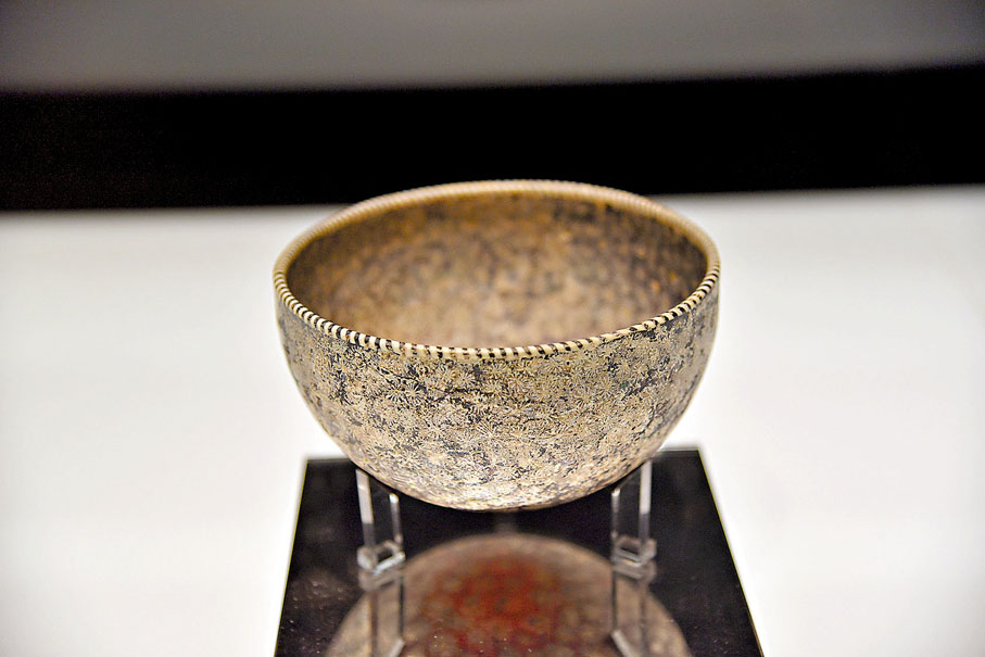 另一件同出於東地中海地區的「千花紋碗」,其所使用的馬賽克玻璃片紋樣較為特殊,宛若焰火或者光芒,在深藍色的底色上,金色的千花紋更顯耀眼。而心思細膩的工匠還在碗的口沿處加上了條紋裝飾,將多種玻璃製作技術結合使用,非常獨特且精美。