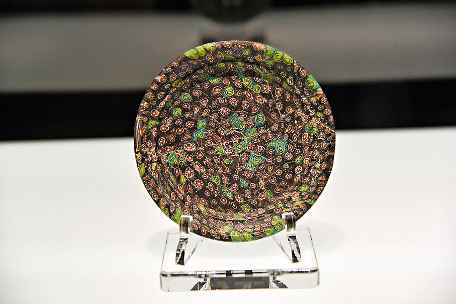 「絲路琉光」展最光彩耀眼的「馬賽克」區域,不僅展出了當時富裕階層用於裝修的馬賽克植物紋圖案玻璃裝飾板,同時還有精美絕倫的「千花紋」杯、碗、盤等。特別是羅馬帝國早期的「千花紋盤」,使用了紅白色、黃綠色和深藍色的馬賽克玻璃片融合成玻璃板,通過熱下垂法成型。由於玻璃加熱時馬賽克片自由融合在一起,也使得紋樣帶有很強的偶然性和流動感,因此這件玻璃藝術品堪稱自然之力與巧奪天工創意技術的完美結合。