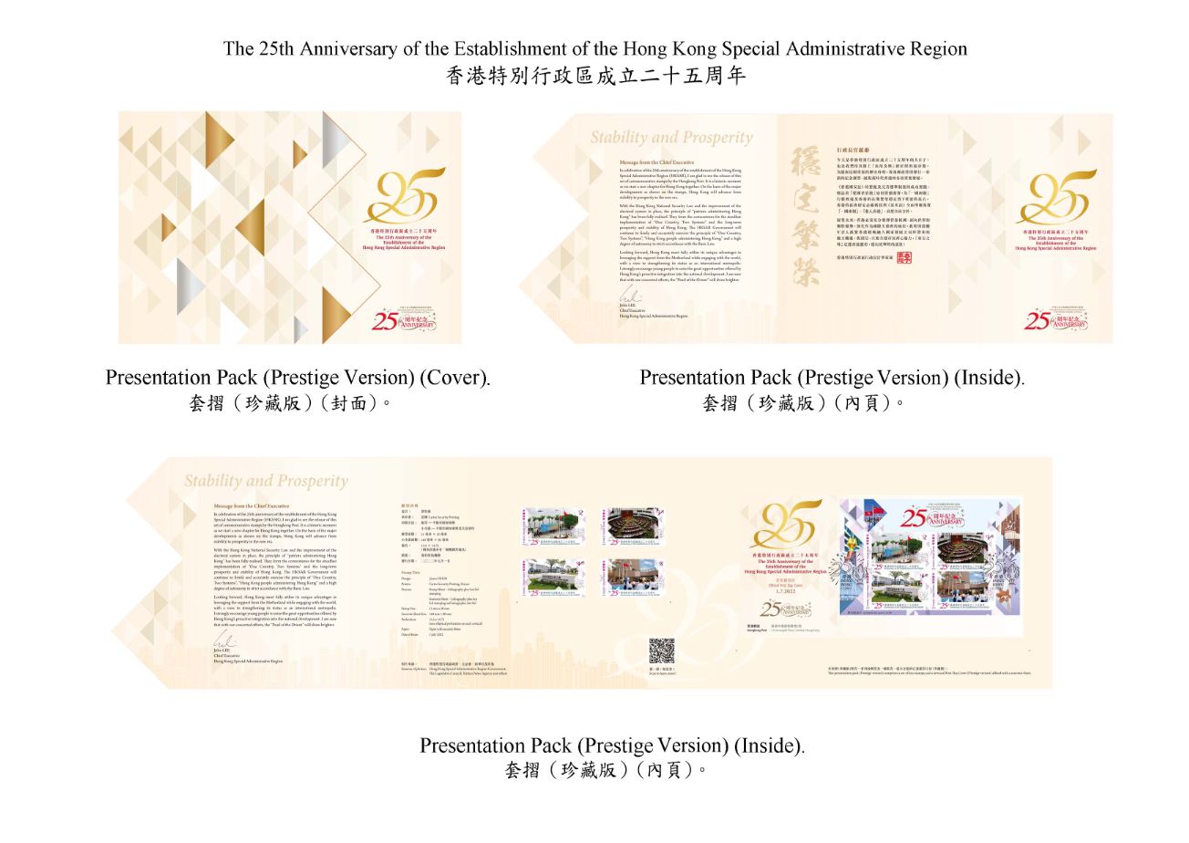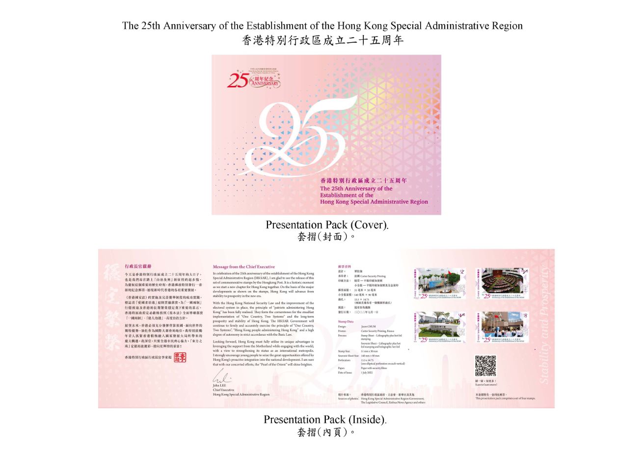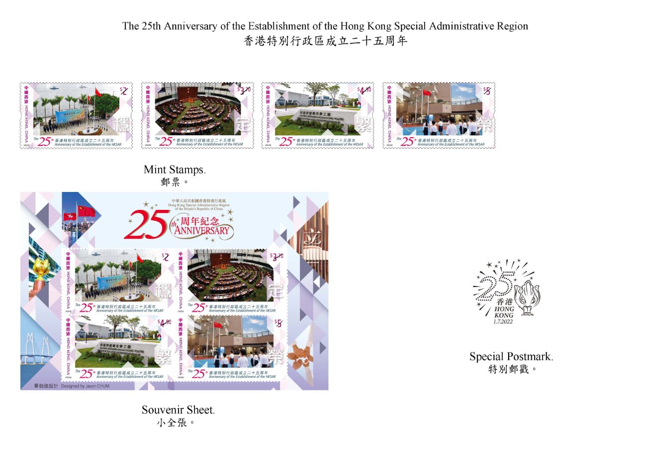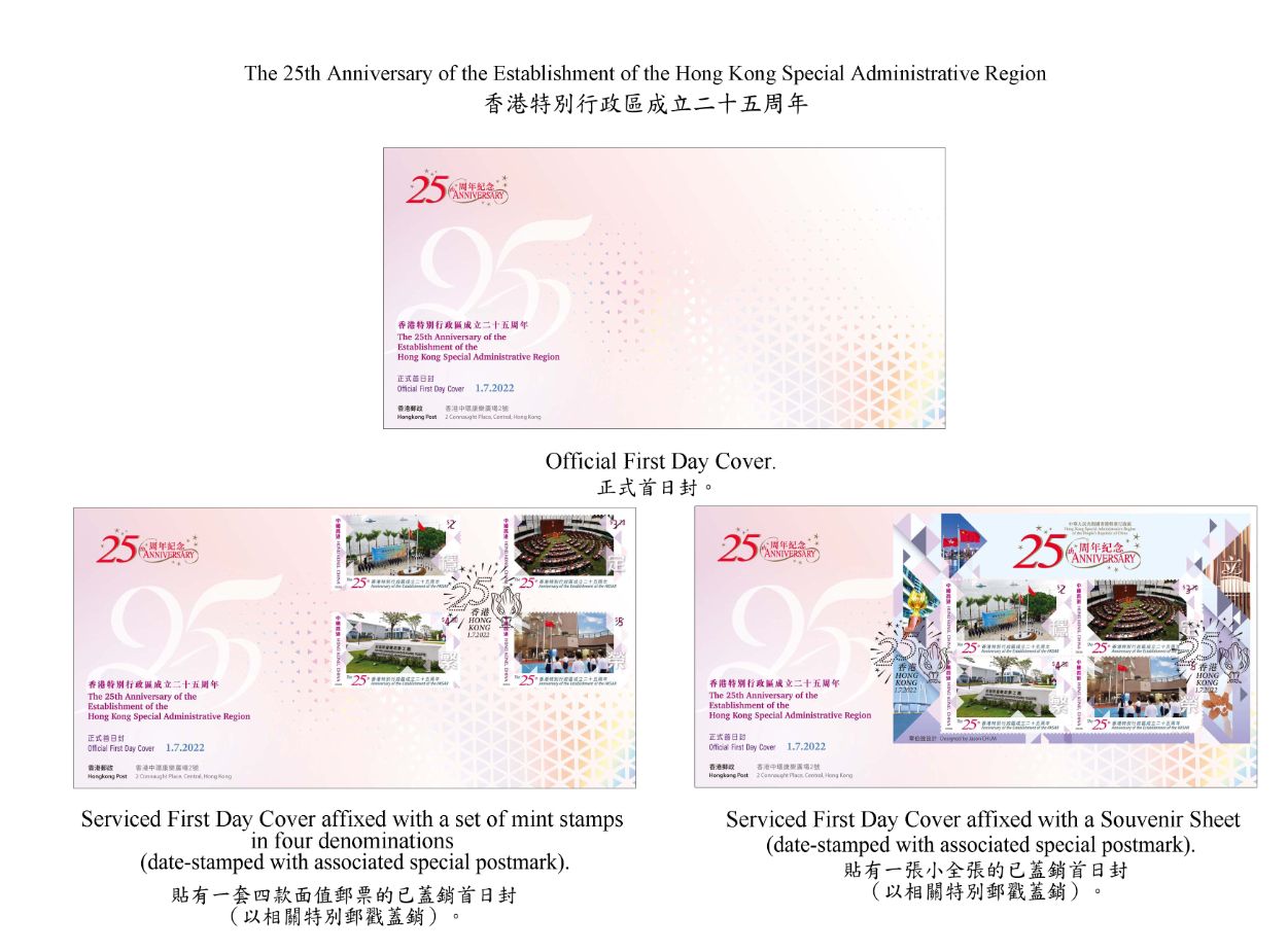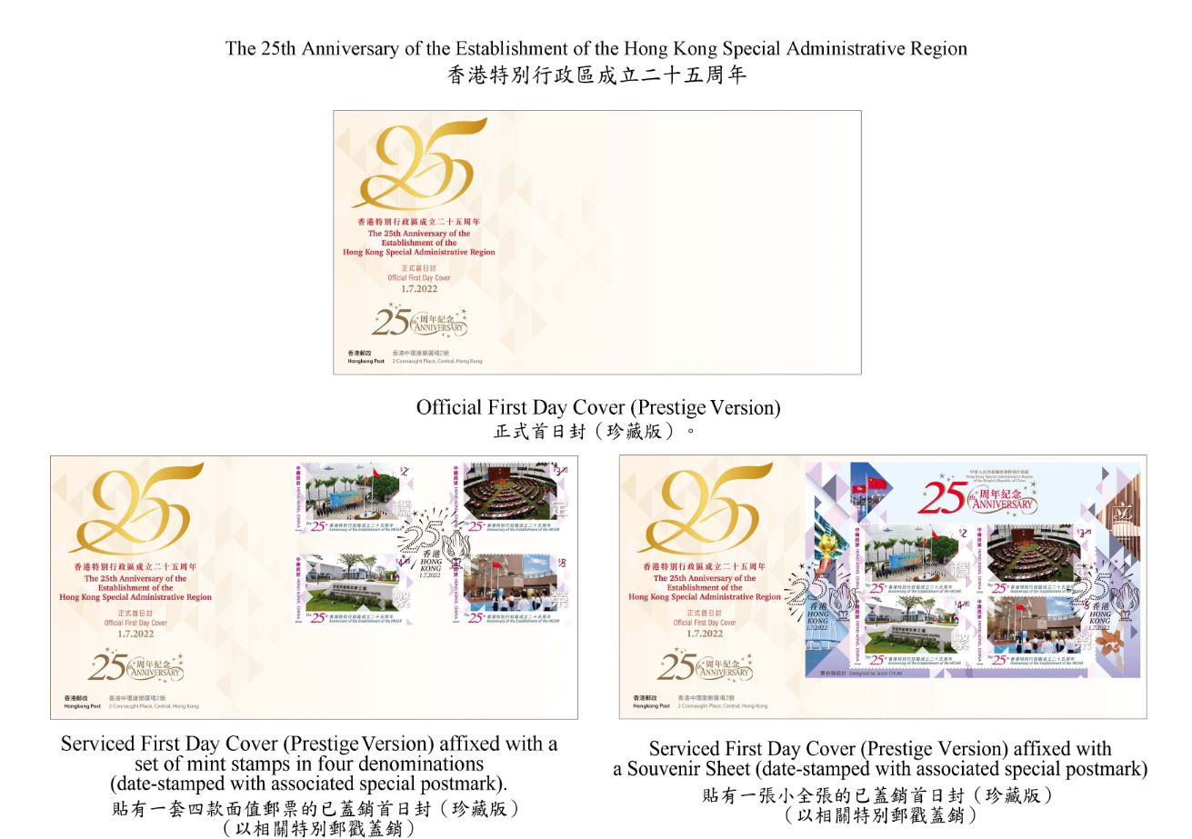 大公文匯全媒體報道:今年是香港特別行政區成立25周年,以「香港特別行政區成立二十五周年」及「中國人民解放軍進駐香港二十五周年」為題的紀念郵票及相關郵品將於7月1日(周五)推出發售,下周一(20日)起於全線37間郵政局(郵局名單)及「郵購網」發售正式首日封。