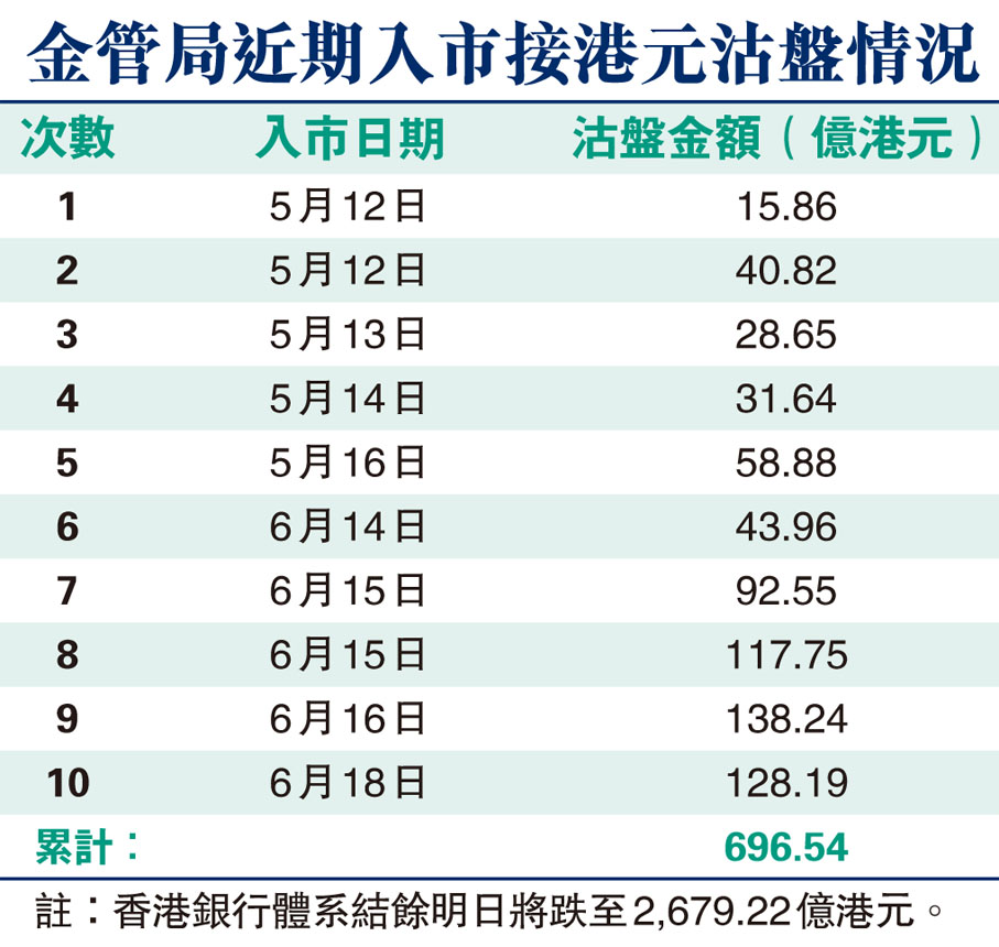 金管局在香港時間上周六凌晨(紐約交易時段)再接港元沽盤,買入約128.19億港元。本周二,本港銀行體系結餘會減少至約2,679億港元。自5月12日凌晨起,金管局已十度接錢,共計逾696億港元。