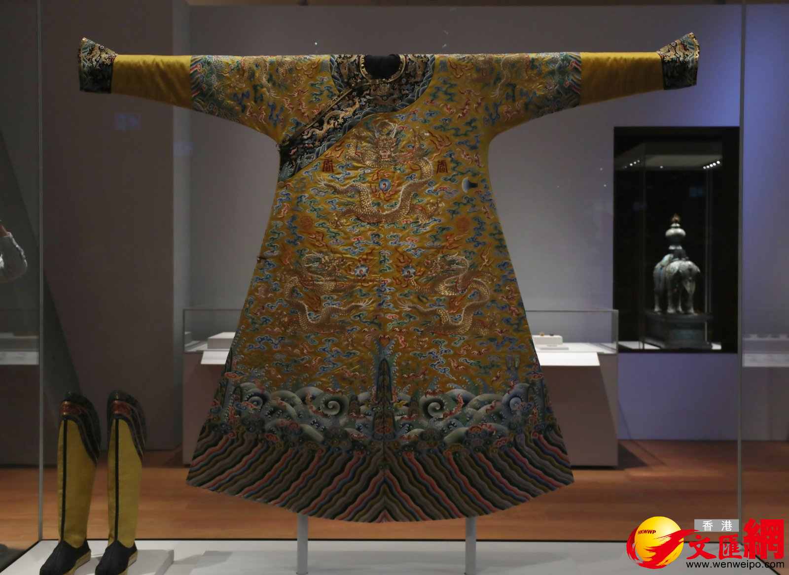 (香港文匯網記者 唐文)由於今日(22日)參與香港故宮文化博物館傳媒預展的機構眾多,主辦機構將記者們分組,每組有不同觀展路線。整個參觀時間約2小時,但要完整逛完9個展廳,時間遠遠不夠。記者一路上走馬觀花下來,印象最深的就是展廳2「紫金一日:清代宮廷生活」。香港故宮文化博物館副館長王伊悠介紹指,展廳2是館內所有展廳中面積最大的,約1700平方米,在策展上,團隊用足巧思,因為要表現乾隆皇帝、太后、嬪妃等宮中人一天的生活,展廳的光影效果也隨着晨昏有變化,皇帝一般在凌晨4時起床,展廳入口的燈光相對昏暗,配合當時未破曉時的天色,該區域設有龍袍、靴子等皇帝服飾,讓觀眾體會皇帝晨起穿衣的程序。