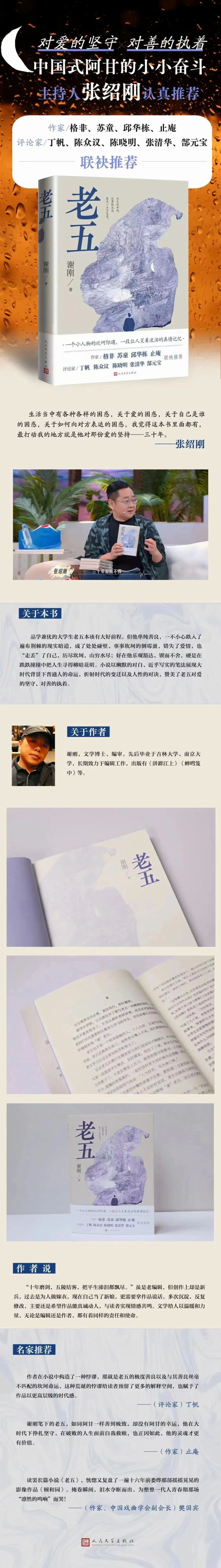 2022年6月21日,人民文學出版社舉辦了題為「談談青春、談談奮鬥」的新書分享會,會上分享了人民文學出版社近期推出的長篇小說《老五》。中宣部原副秘書長、出版局原局長、中國圖書評論協會會長郭義強,中國出版集團有限公司黨組成員、中國出版傳媒股份有限公司總經理李岩,著名作家、中國作家協會書記處書記邱華棟,人民文學出版社社長臧永清參會並致辭。著名學者、文學評論家張清華,著名作家、評論家止庵,著名主持人、中國傳媒大學教授張紹剛,青年作家、《當代》雜誌副主編石一楓,以及本書作者謝剛在會上進行了分享。