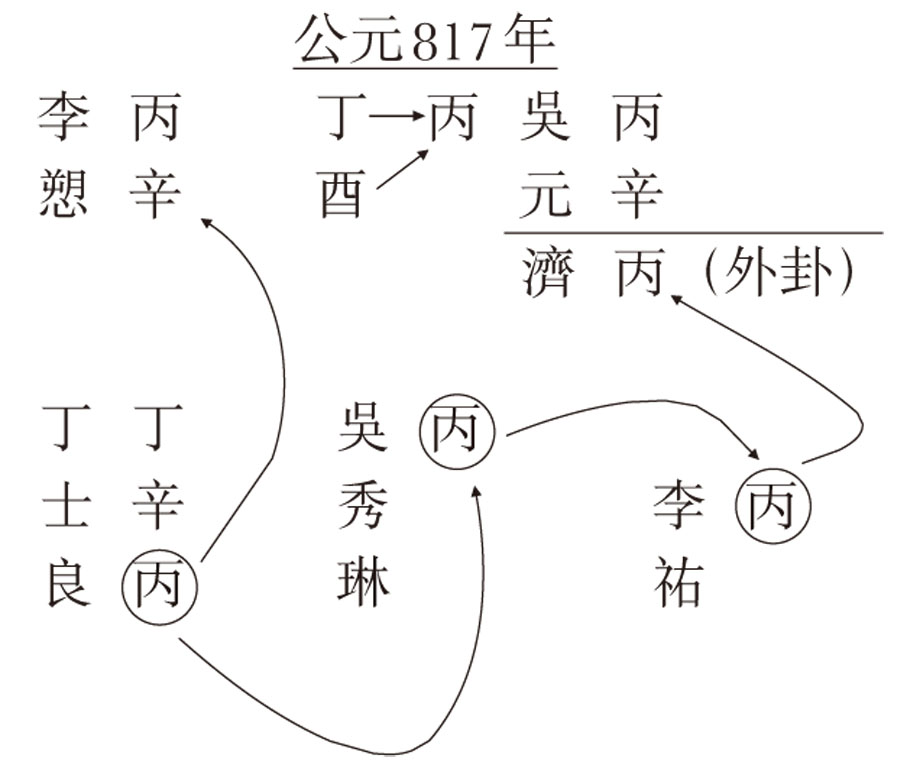 所以,雖然二人的頭二字五行均為丙辛,但當諸法因緣生的時候,兩人注定要對壘,那李愬自然稍勝吳元濟。由於丙辛丙,兩火爭一金,本屬自己的部下,居然蟬過別枝,更神奇的是三個蟬過別枝的將領皆屬火的五行,丁士良是丁火辛金丙火,吳秀琳及李祐的姓氏五行也是丙火。由於吳元濟(丙辛丙),頭尾相同,表示在大部分的狀況中,也會出現自我感覺良好,現代語所謂「自戀」,故警戒心自然也低了一點。