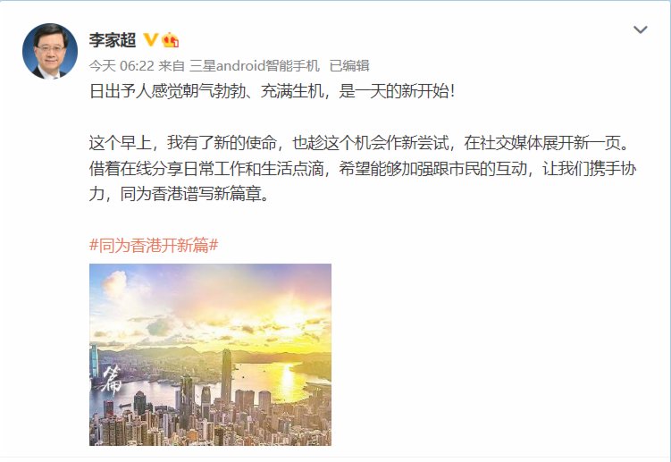 李家超說,「這個早上,我有了新的使命,也趁這個機會作新嘗試,在社交媒體展開新一頁。藉着在線分享日常工作和生活點滴,希望能夠加強跟市民的互動,讓我們攜手協力,同為香港譜寫新篇章。」