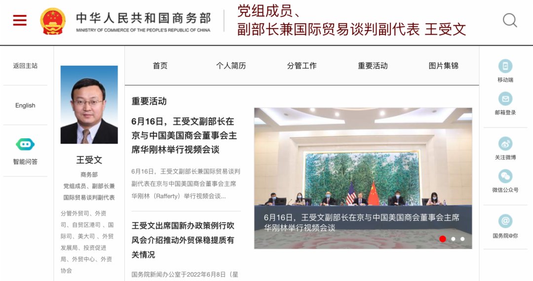 商務部網站顯示,王受文此前為商務部黨組成員、副部長兼國際貿易談判副代表,分管外貿司、外資司、自貿區港司 、國際司、美大司 、外貿發展局、投資促進局、外貿中心、外資協會。
