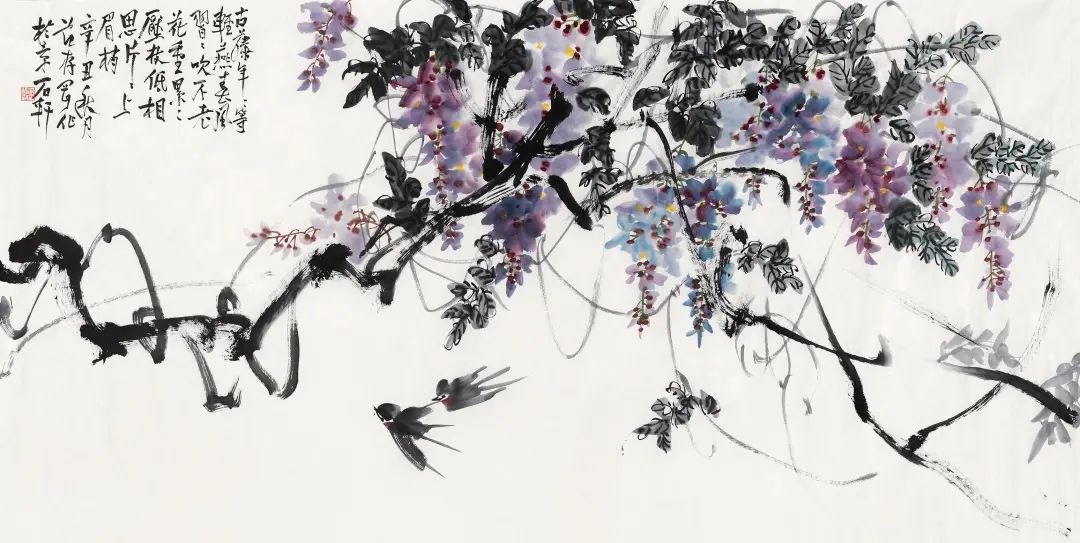書畫同修並習是范存剛的一貫狀態。多年來,他按照其師吳悅石先生的教導,持書畫雙楫,勤奮研習書畫之關係,研究書法這門中國獨特藝術的用筆、結體、章法之規律。他了悟黃賓虹所強調的畫畫「當如作字法,筆筆宜分明」的道理,以書法為根基,以書入畫。固所寫之物象能骨力洞達、雄強有力,且有民族審美之意韻。觀其寫意花鳥,一枝一葉一鳥,均以書為基,筆法之抑揚頓挫與物象曲直錯落融為一體,其以書入畫、書畫互滲的特點,也正是與許多同代畫家的不同之處。
