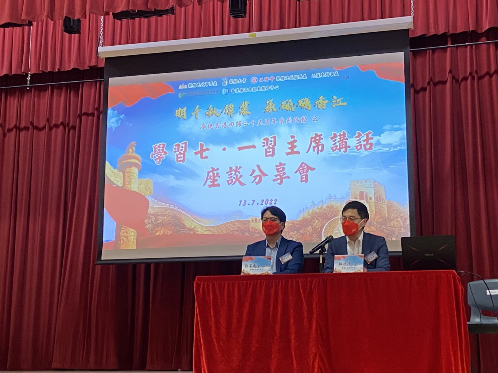 觀塘民政事務處繼7月8日及10日後,今日聯同龍騰志青、工聯會觀塘地區服務處、工聯會九龍東辦事處、香港觀塘工商業聯合會及香港廣西九龍東服務中心,在秀茂坪社區會堂舉辦「學習七一習主席講話座談分享會」,由立法會議員鄧家彪及觀塘民政事務專員林兆康擔任主講嘉賓。港區全國人大代表、行政會議成員兼立法會議員吳秋北亦透過短片分享,龍騰志青會長汪紅、工聯會觀塘地區服務處主任簡銘東、香港廣西社團總會會長文頴怡及香港觀塘工商業聯合會會長余敏亦在會上致辭及分享。超過200人出席今日的座談會,與會者包括觀塘區內領袖及中小企代表、居民及青年。