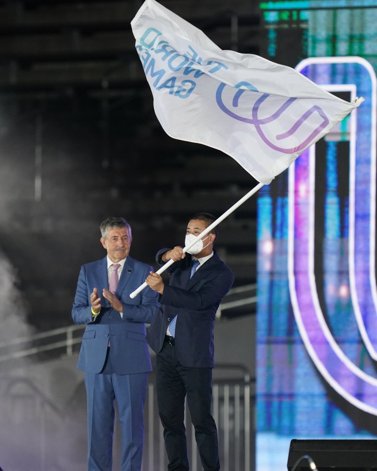 當晚,在暖場表演、入場儀式、嘉賓致辭等環節後,閉幕式迎來接旗儀式和「成都時間」文藝展示。在接旗儀式環節,國際世界運動會協會會旗從美國伯明翰交接到中國成都。隨後,成都作為下一屆世界運動會舉辦城市,呈現了精彩的「成都時間」大型展演。