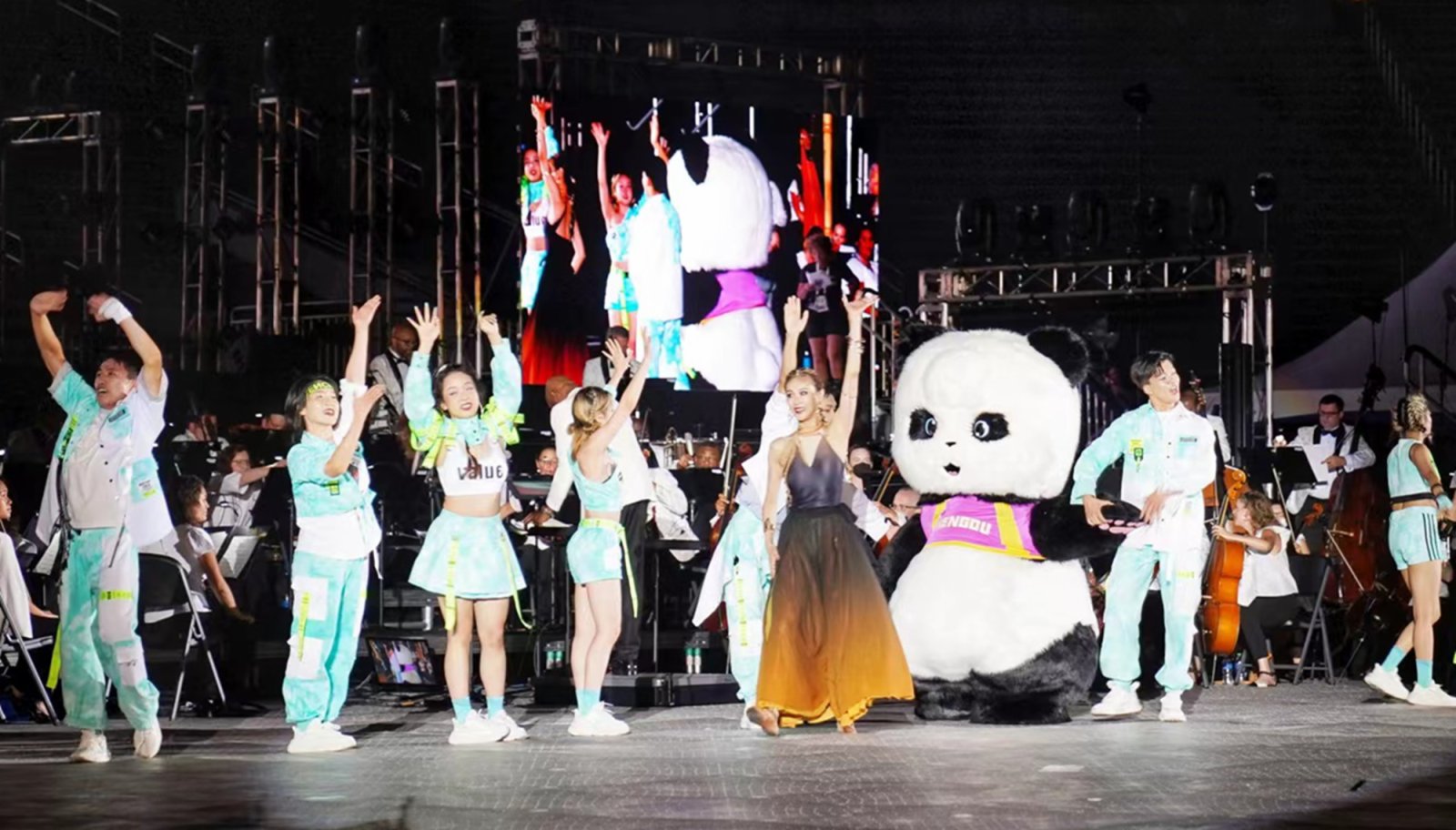 「成都時間」文藝展示以秋、冬、春、夏四季為順序展開,隨四季的變換呼應出音樂、舞蹈、燈光視效等元素的變化。寓意豐收、成就的「秋」,以美輪美奐的視頻畫面展現大美的雪山下的公園城市。「冬」,則以獨舞的形式展現傳說中的太陽神鳥對蜀人的護佑。在朝氣蓬勃的「春」的篇章,世運會的各個比賽項目則與成都人的日常生活、運動完美地結合在了一起。「夏」的熱情與活力,則以伯明翰現場與視頻呈現的成都地標場景中的啦啦操街舞演員鬥舞展現。在「友誼地久天長」樂曲聲中,來自成都各行各業的人們熱情歡迎全世界的朋友來到成都。最後,憨態可掬的熊貓人偶,向全世界發出2025年相約中國,相約成都、「Welcome to Chengdu」的邀請。