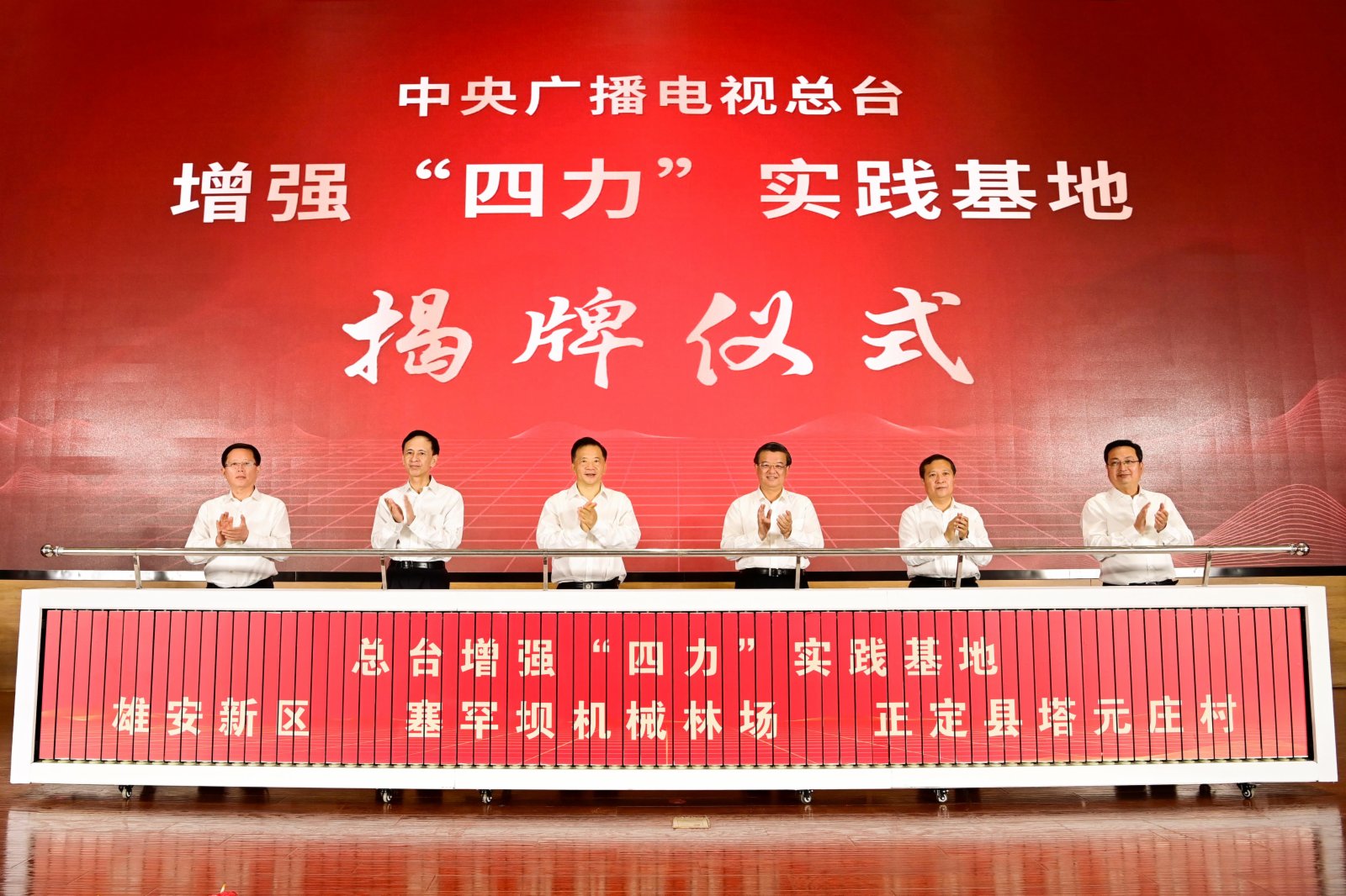 倪岳峰、慎海雄與河北省委副書記、秘書長廉毅敏,河北省委常委、副省長,雄安新區黨工委書記、管委會主任張國華及中央廣播電視總台黨組成員、副台長閻曉明、蔣希偉共同為總台增強「四力」實踐基地揭牌。