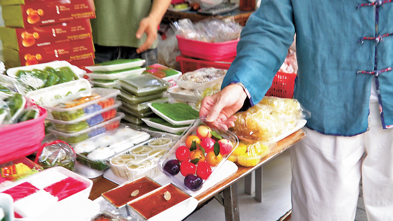 「來來來,這個地方我經常來買他們的東西,早晨,你看,這些甜品,『有駕車來嗎﹖』有,車泊很遠。你看很多人喜歡吃的鳳爪,你看,大部分你現在看見吃的東西,都是從泰國運過來的,你看這個,買回去多漂亮,綠豆做的,買回家怎麼捨得吃﹖其實我也餓了,其實我拍了很久了,其實你們夠不夠,拜拜了,進去吃。」