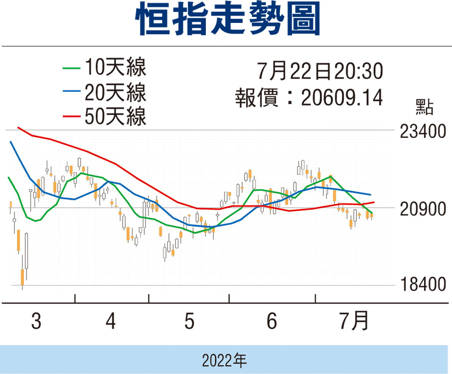 上周的港股繼續於20,294至21,111點間築底。大趨勢無變:前一個熊市已於今年3月的18,415點(日中低點18,235點)見底,其後的四個多月恒指於18,415至22,502點間浮動,跳上跳落。由於客觀環境複雜兼多變,令到人心虛怯,於是大市飄忽不定。衍生工具市場成交活躍,無論是指數還是個別熱門科技股的衍生產品及沽空活動,都提供足夠的波幅,讓大資金炒上或質落,十分刺激。