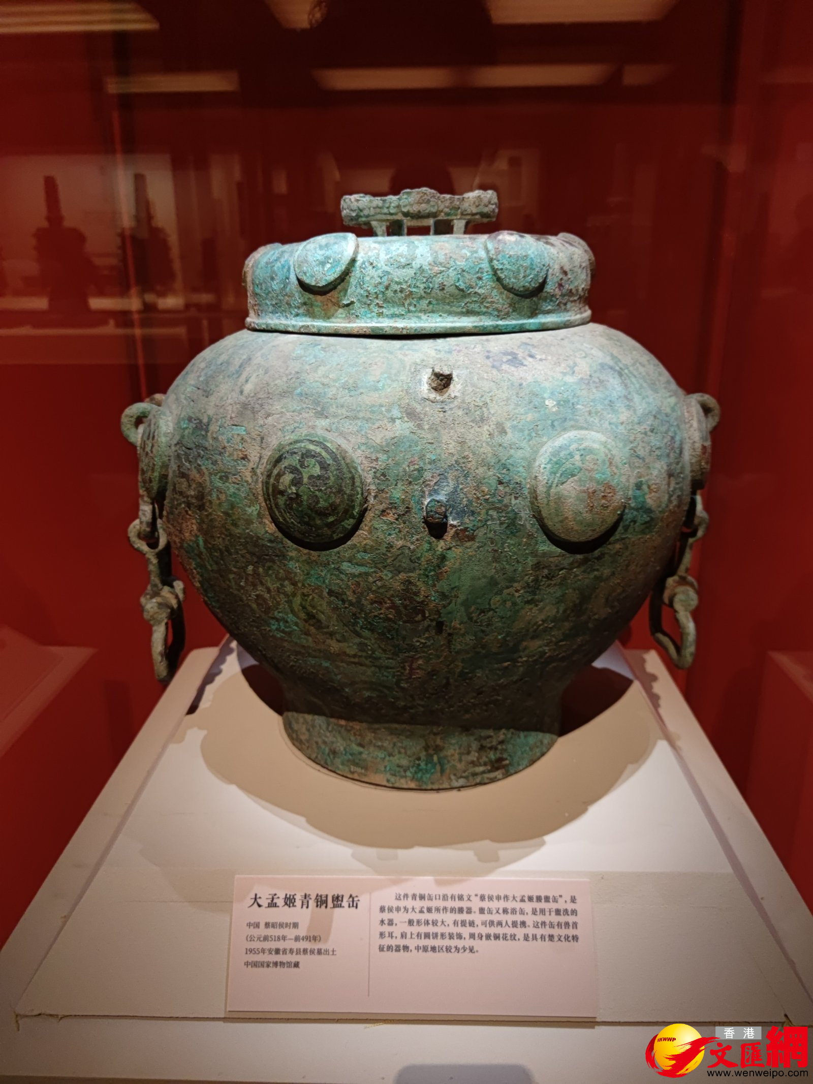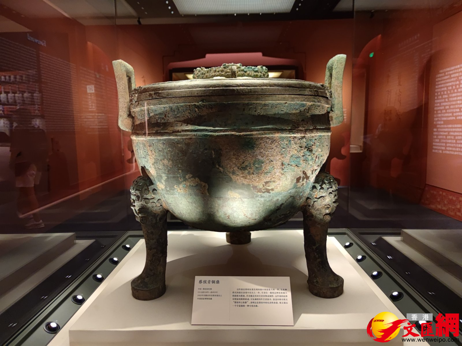 展覽的三個單元中,每個單元都有主角。安徽壽縣蔡侯墓出土的幾組代表性青銅器是中方代表。其中,蔡侯青銅鼎是蔡昭侯墓發現的鼎中體量最大的一件,且此種樣式的鼎是該墓中僅出土的一件。策展人介紹,這件鼎的底部有明顯煙熏痕迹,說明曾經當做蒸煮器使用。器蓋內有銘文,表明這是蔡侯申的禮儀性食器。蔡侯簋、尊、鑒、缶、方壺、編鐘等也一同亮相。
