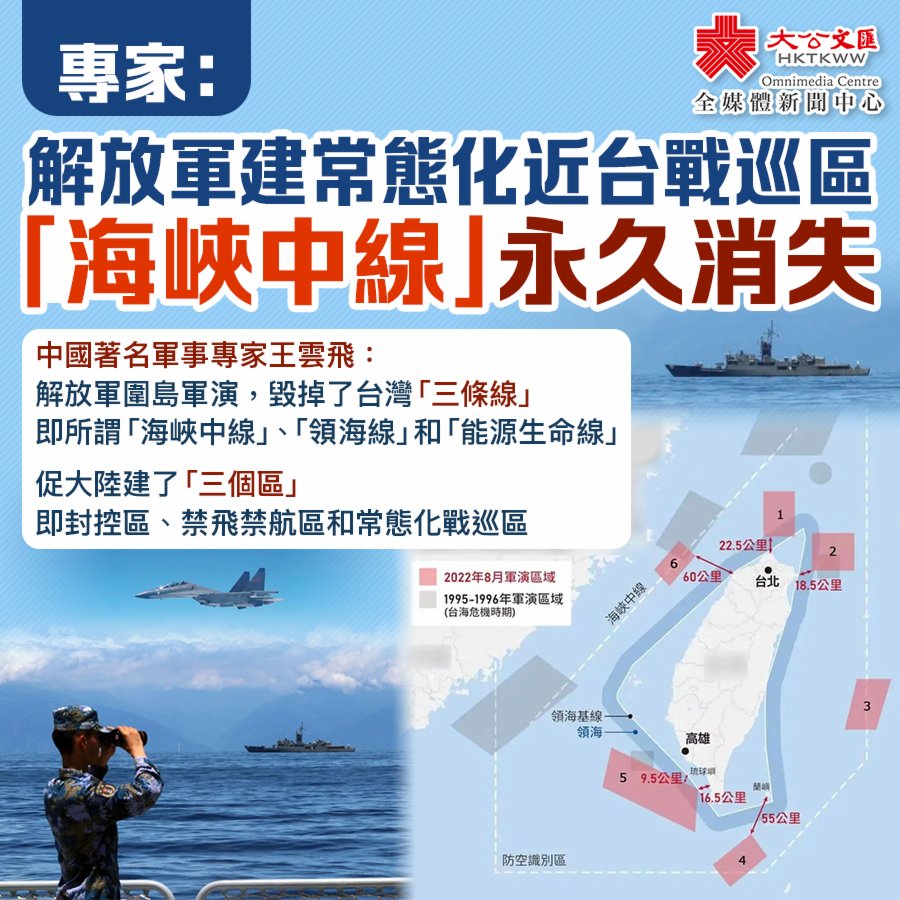 王雲飛稱,毀傷台灣「三條線」,促進大陸建立「三個區」,全拜佩洛西竄訪台灣所賜。得益於常態化近台戰巡區的設立,今後對台軍漢光演習等,大陸軍機、軍艦可能會更多地撲過去;台灣武器試驗活動,大陸也可能會更多地盯上去。平時,也會在常態化近台戰巡區進行例行性的戰備巡邏活動。