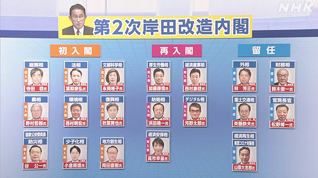 在本次改組中,共有14個職位換人。據日媒報道,改組前的安倍胞弟防衛大臣岸信夫、文部科學大臣末松信介、經濟產業大臣萩生田光一、環境大臣山口壯、經濟安全保障擔當大臣小林鷹之、地方創生擔當大臣野田聖子、國家公安委員長二之湯智7人都承認與「統一教」之間存在聯繫。