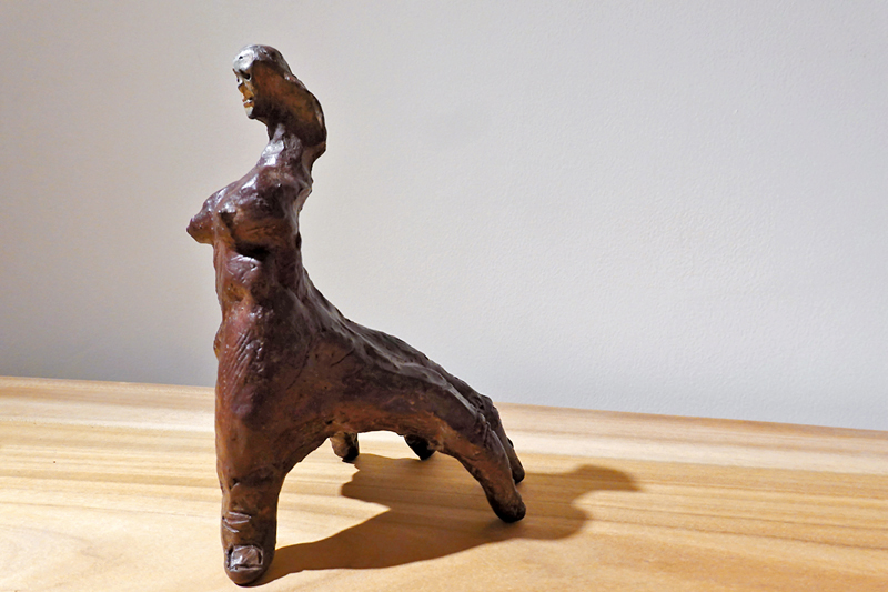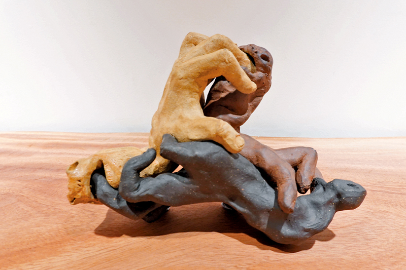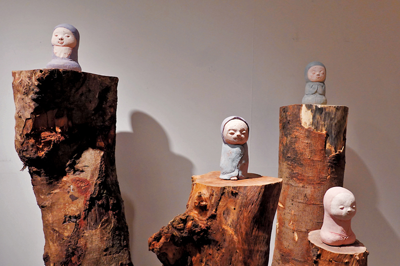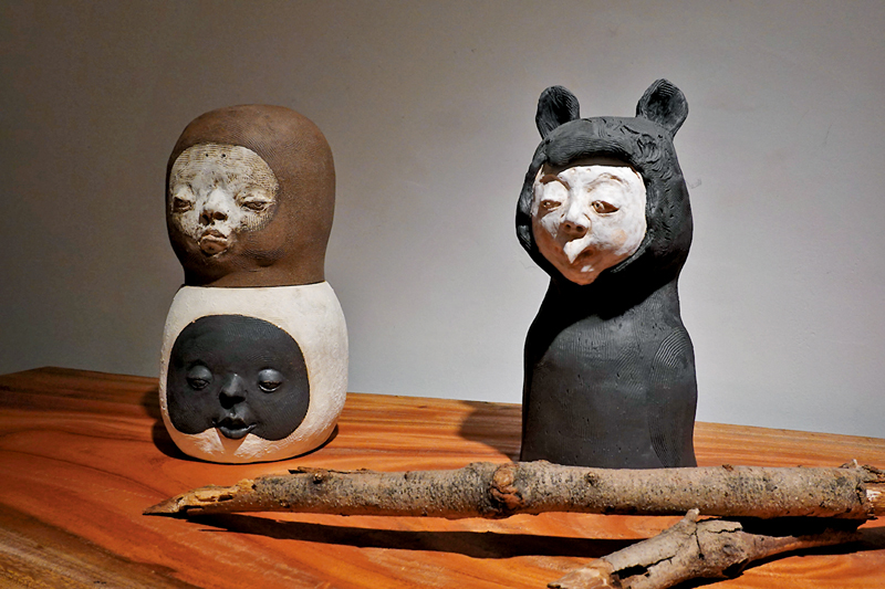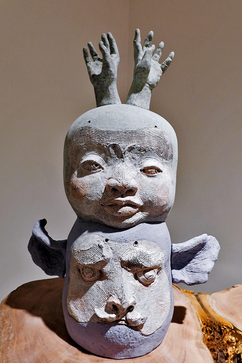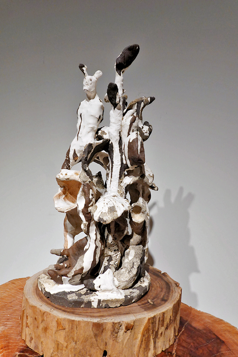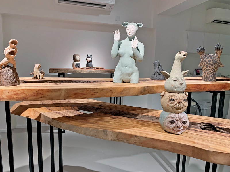 新藝潮畫廊現正進行「土木共情——曹涵凱×香港木庫」展覽,展出曹涵凱創作的二十多件陶泥、銅等雕塑作品,配合「香港木庫」多件原木作品展出。甫入畫廊,撲面而來的木香營造出熱帶森林的氣息,「香港木庫」提供的多個高低錯落的流水線條形原木枱及木頭樹樁,與藝術家色彩樸素、氣質原始的陶土作品相得益彰。今次展覽最值得關注的是曹涵凱從2022年開始創作的新系列作品,從塑造形象的變化中,可以看到藝術家對於現代人性的反思與想像的延伸。