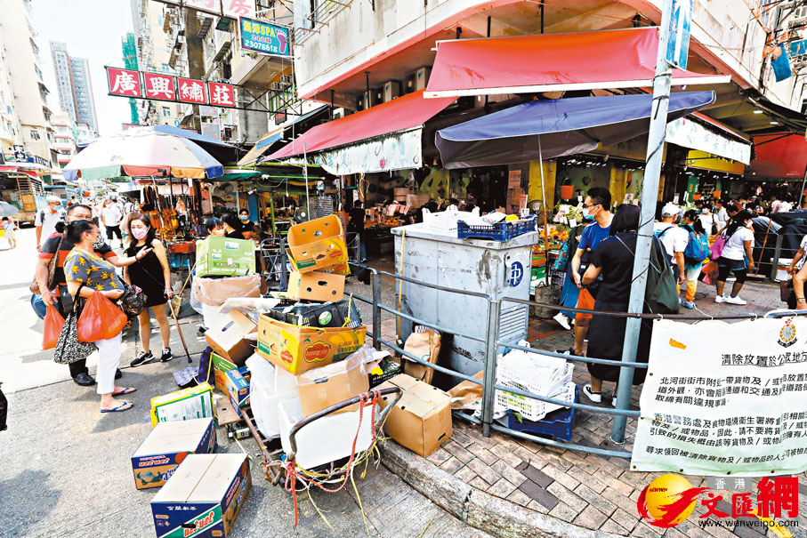 至於一直是衞生黑點「常客」的北河街街市一帶,現場所見仍有不少商戶將貨品及發泡膠箱等擺出街道,地面有一攤攤積水;街市對出一間蔬果店外,亦堆疊一個個菜籃、紙皮等。