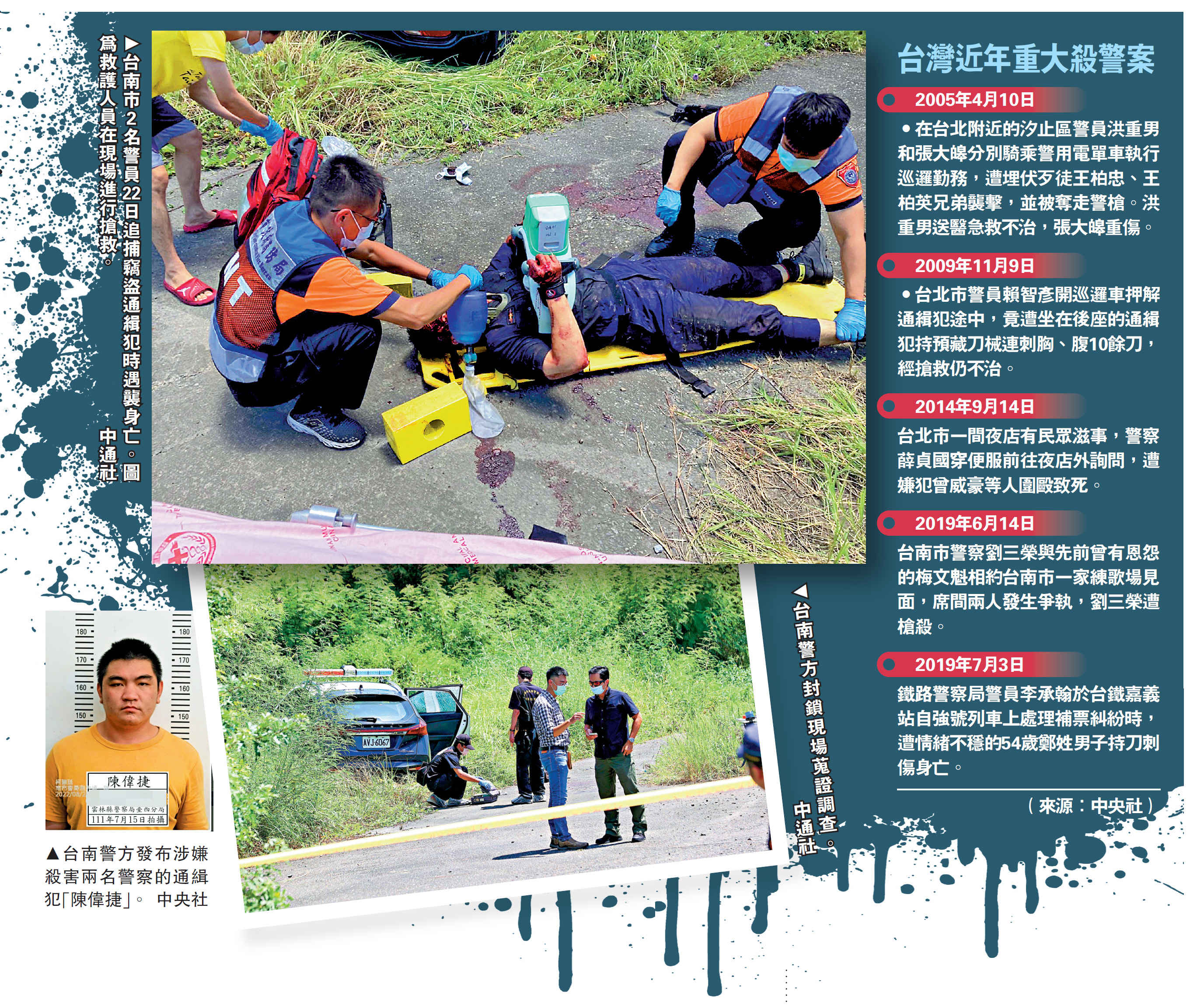 大公報綜合台媒報道,台灣台南市22日發生重大殺警案。兩名警察追捕嫌犯時遭到攻擊,頸部、胸部等身上多處都有刀傷,其中一名警察的頸動脈被割斷。兩人送醫急救後仍宣告不治,其中一名警察的佩槍及彈匣被歹徒搶走。事件震驚全台。島內輿論指出,台灣社會治安惡化的程度令人震驚,「人口販賣案」還沒有完結,如今又發生駭人聽聞的殺警案,還有早前島內頻頻發生槍擊案,民進黨當局難辭其咎。這些年,蔡英文和民進黨幾乎把所有心思都放在破壞兩岸關係上,漠視島內民生,以致島內經濟、治安等不斷出現問題。