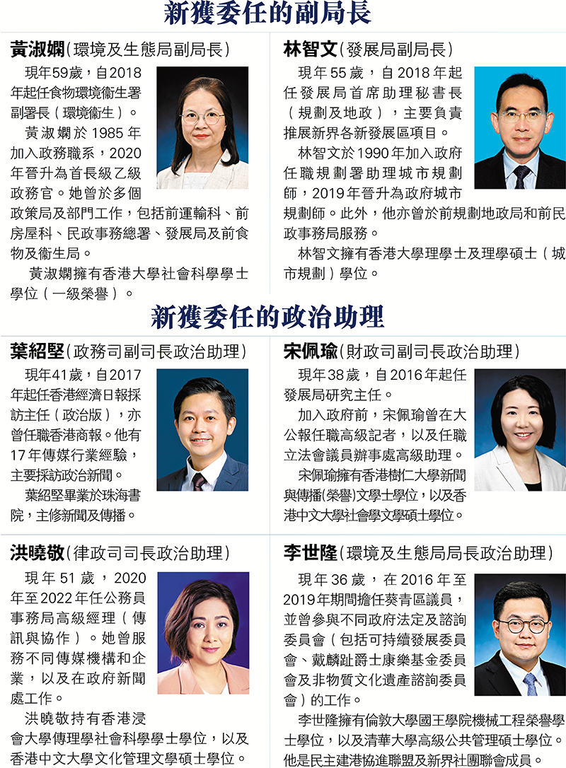 新獲委任的副局長包括環境及生態局副局長黃淑嫻、發展局副局長林智文;政治助理包括政務司副司長政治助理葉紹堅、財政司副司長政治助理宋佩瑜、律政司司長政治助理洪曉敬、環境及生態局局長政治助理李世隆。
