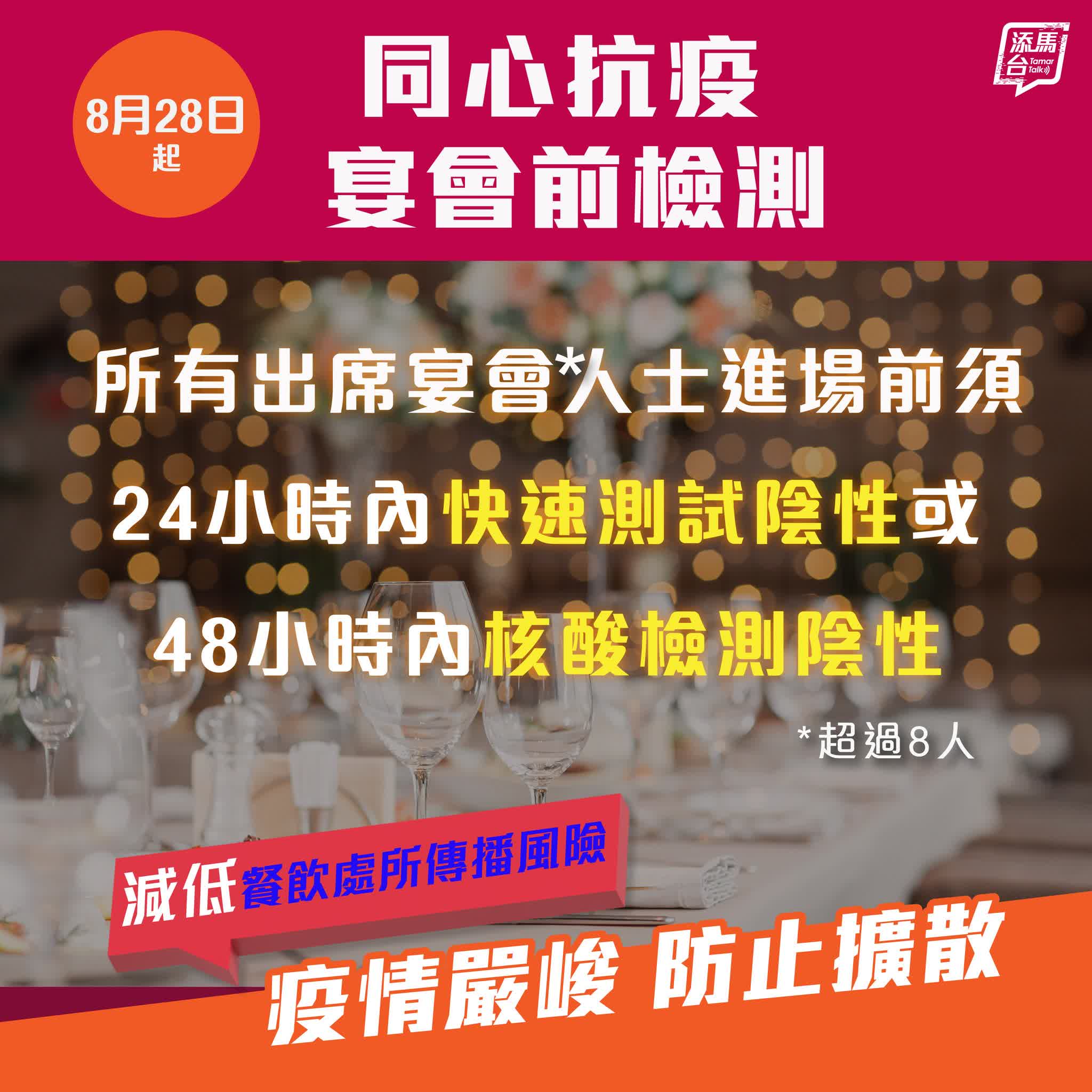 食環署解釋,宴會是指多過可同坐一桌的顧客,在有共同目的下一同於餐飲處所用膳。舉例來說,進行快速抗原測試規定不適用於8名分兩枱共同用膳的顧客,但適用於9名分兩枱共同用膳的顧客。