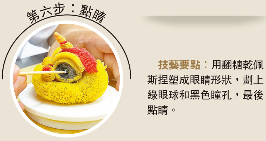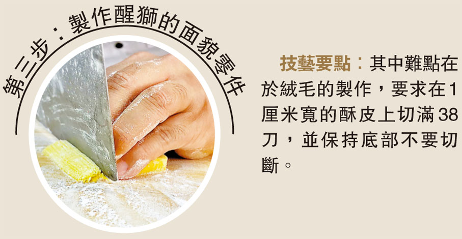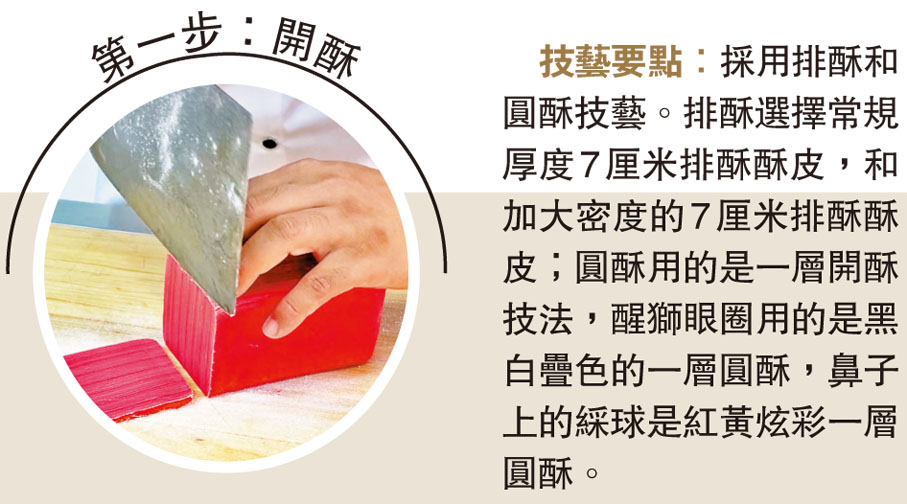 技藝要點:採用排酥和圓酥技藝。排酥選擇常規厚度7厘米排酥酥皮,和加大密度的7厘米排酥酥皮;圓酥用的是一層開酥技法,醒獅眼圈用的是黑白疊色的一層圓酥,鼻子上的綵球是紅黃炫彩一層圓酥。