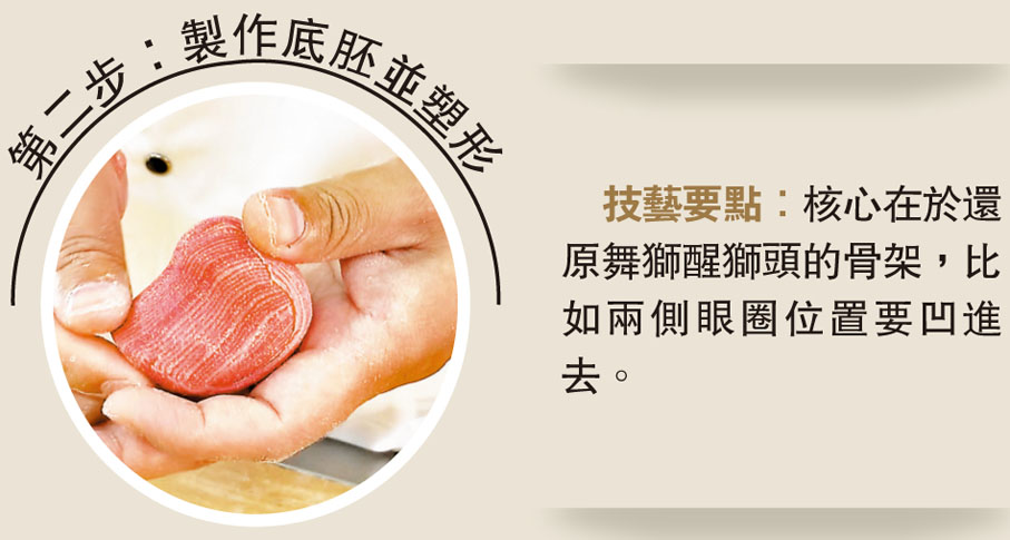 技藝要點:核心在於還原舞獅醒獅頭的骨架,比如兩側眼圈位置要凹進去。