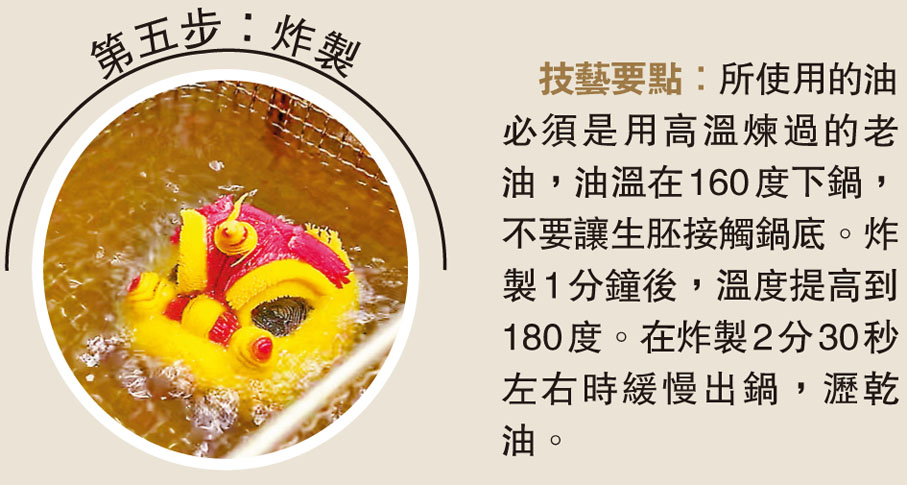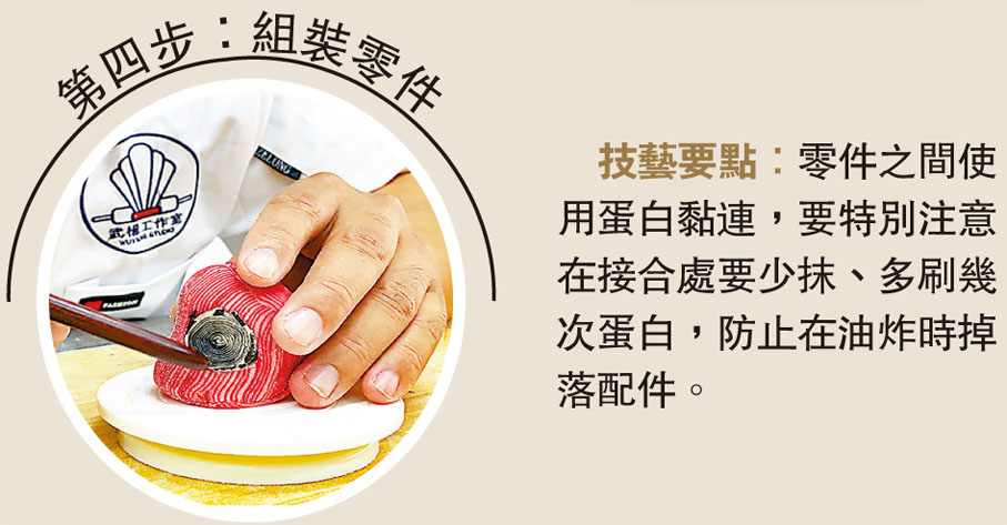 技藝要點:零件之間使用蛋白黏連,要特別注意在接合處要少抹、多刷幾次蛋白,防止在油炸時掉落配件。