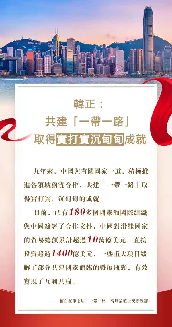 韓正提到,2013年秋天,習近平主席提出共建「一帶一路」倡議,符合世界上絕大部分國家謀求發展繁榮的共同願望,得到國際社會的廣泛認同和熱情參與。九年來,中國與有關國家一道,積極推進各領域務實合作,共建「一帶一路」取得實打實、沉甸甸的成就。