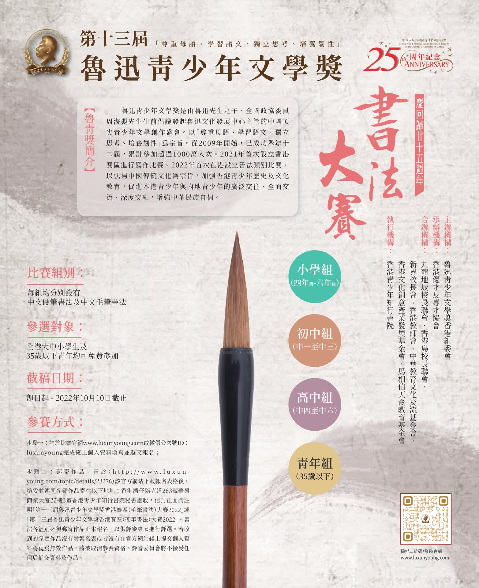 大公文匯全媒體報道:為慶祝香港回歸祖國25周年,第十三屆魯迅青少年文學獎香港賽區書法比賽今日(9月1日)正式啟動。即日起,全港大中小學生及35歲以下青年均可免費參加,徵稿截止日期為10月10日。