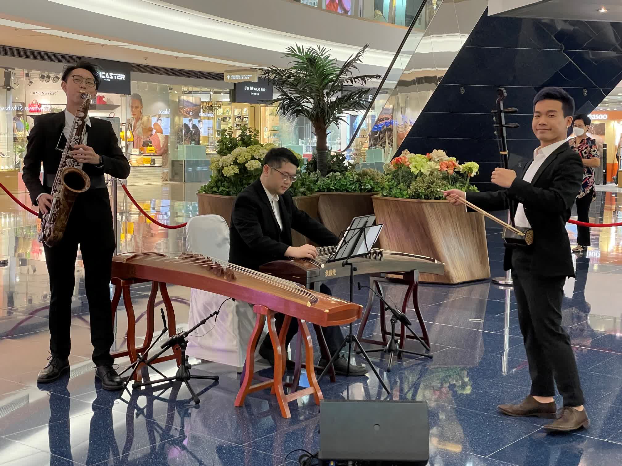 三重奏表演,樂手以中西樂器,包括二胡、古箏及色士風,現場合奏多首名曲經典。演奏樂手包括本地精通胡琴演奏家李家謙、於古箏比賽中屢獲殊榮的鍾朝而,以及參與多隊知名爵士樂大樂隊演奏的色士風樂手黃嘉豪。三位專業樂手將中西樂器融合,以三重奏的形式演繹多首耳熟能詳的名曲經典,包括「擁抱愛」、「小情歌」、「甜蜜蜜」及「茉莉花」等。