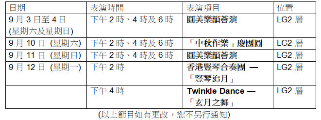 大公文匯全媒體報道:臨近中秋節,又一城將於2022年9月3日至12日的周末及公眾假期,為市民呈獻多場爵士樂演唱、經典名曲三重奏、豎琴及舞蹈表演,在愜意愉悅的藝術氛圍之中,一起共度中秋佳節!演出包括: