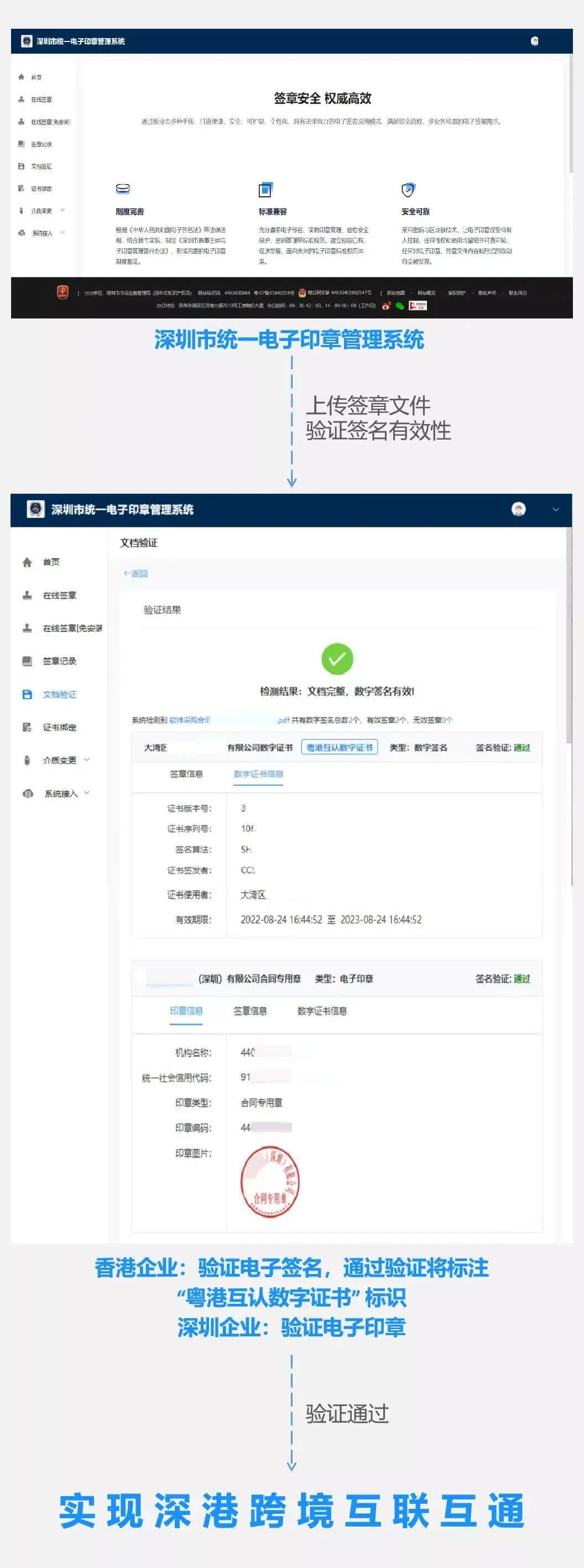 (香港文匯網記者 郭若溪)打開深圳市統一電子印章管理系統,深圳企業上傳簽章文件並驗證簽名有效性,通過驗證後可與香港企業遠程簽約。8月31日,繼深圳與北京實現兩地電子簽章互認之後,據深圳市市場監管局披露,電子簽章互認新增深圳與香港兩地,意味着深港兩地企業可以選擇遠程簽署電子合同,實現不見面簽約。