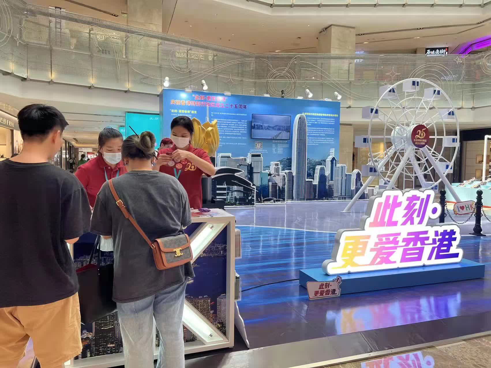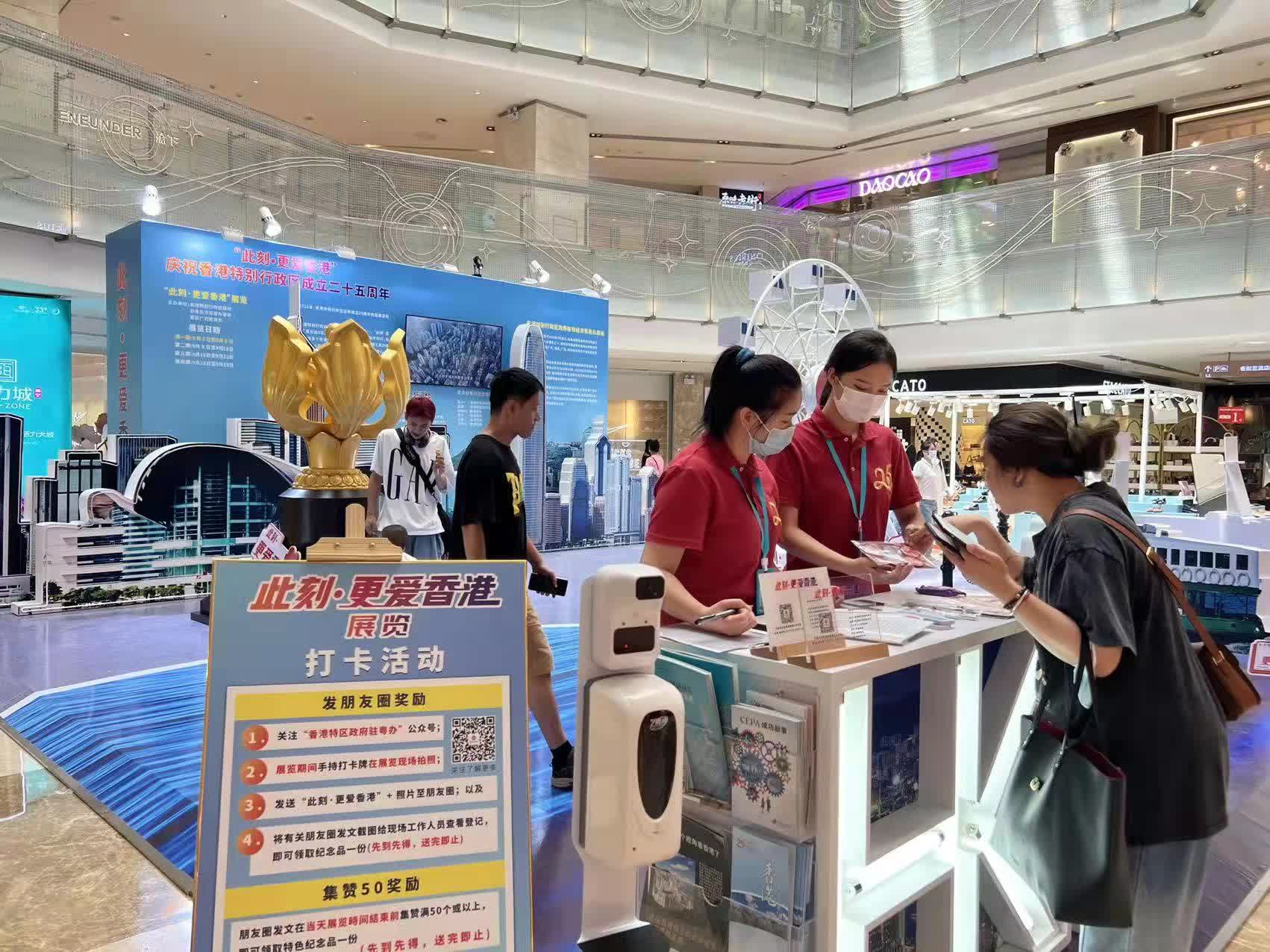 會展·航洋城購物中心是位於南寧標誌性建築東盟會展中心的大型購物中心,眾多當地民眾與現場搭建香港特區區花金紫荊花、維港著名的天星小輪、中環摩天輪的標誌性香港景點合影留念。據悉,展覽向公眾免費開放至9月29日,展出的香港著名景點將逢星期五更新。