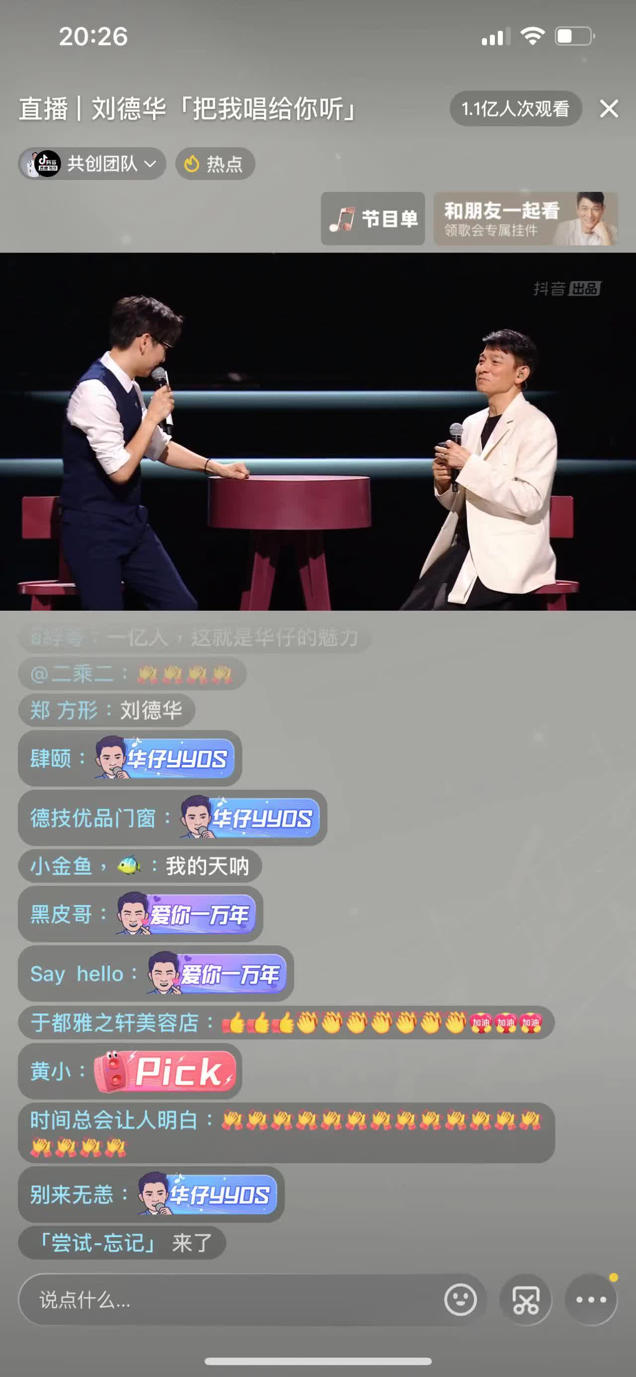 直播剛開場就有超過3900萬人次觀看,在一分鐘的時間裏,人次增加了1000萬,至接近9點,已有逾2億人次觀看。劉德華說:「去年在這裏分享平常的一天,今年還在這裏,把我唱給你聽。」說完,演唱了他的經典曲目《笨小孩》。