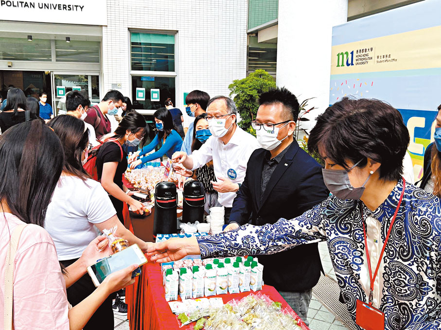 香港都會大學昨日是新學年首天恢復面授課堂。校長林群聲熱烈歡迎學生們回到校園,並連同副校長(學生事務及支援)郭予光於校園向學生派發曲奇和醒神飲品,為他們打氣。