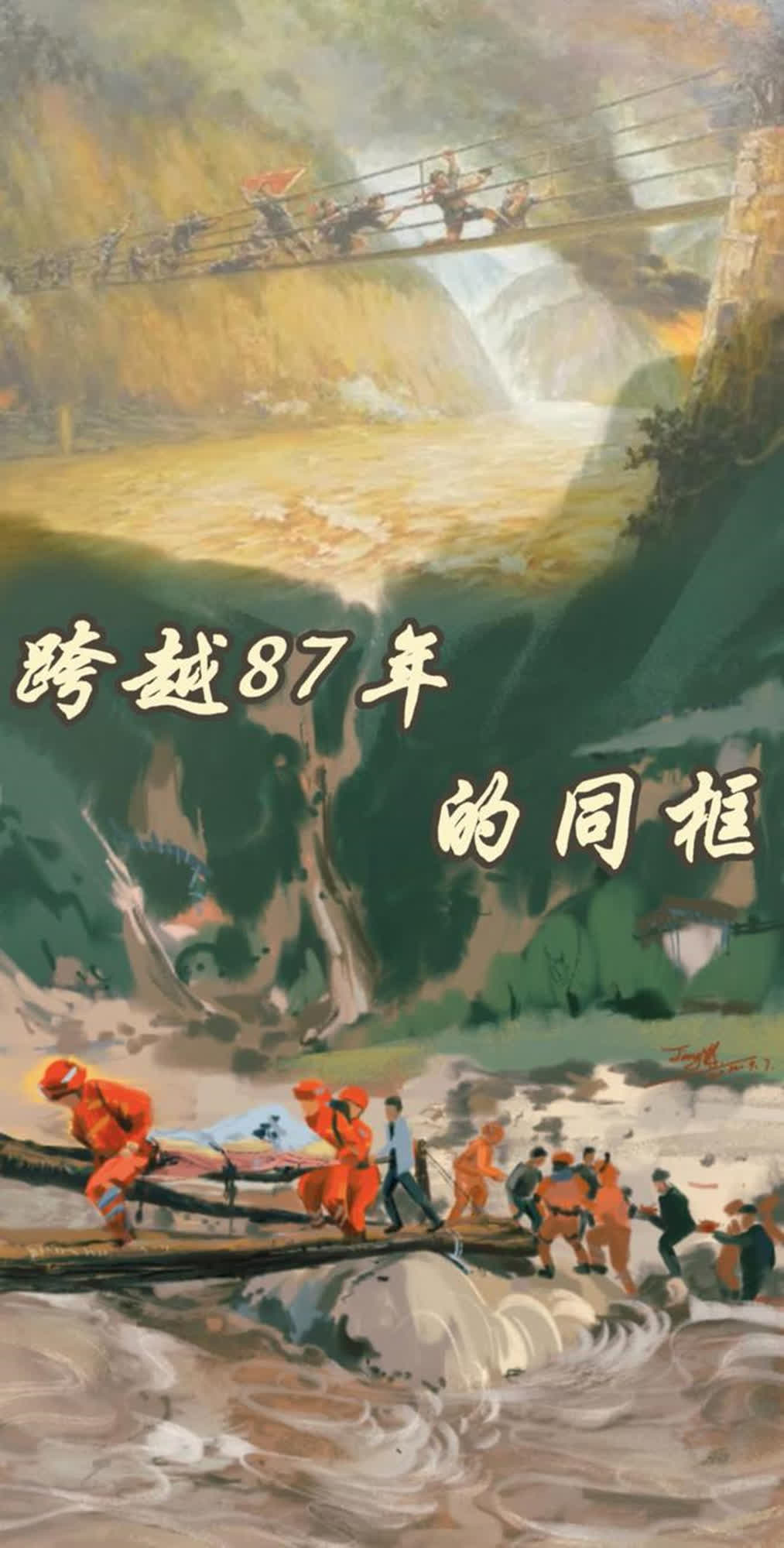 (香港文匯網記者 李兵)22名勇士腰纏手榴彈、背着大刀、手提短槍,冒着槍林彈雨,攀上橫空擺盪的索橋,向敵岸快速爬去;面對湍急的河水,特警隊員用身體、繩索、木頭搭起「生命橋」,全力轉移被困群眾……一幅名為《跨越87年的同框》繪畫作品感動無數網友:「眼淚奪眶而出,感謝您用畫筆記錄這動人一幕。」