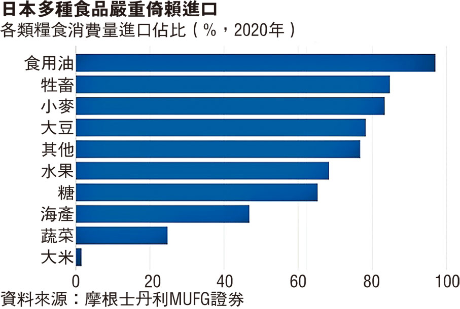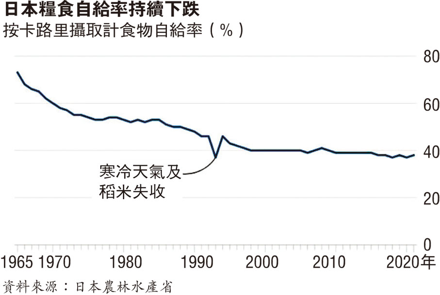 日本一向奉行「高質素、低自給率」的糧食供應體系,即是主力生產高質素食物(例如和牛等),再進口大量糧食以滿足國內需求。這種做法以往被視為全球化的成功例子,但隨着新冠疫情和俄烏衝突打斷全球供應鏈,全球化大倒退,日本亦受到衝擊。日本現時糧食自給率只有38%,是1965年的73%的大約一半,也是發達國家中最低的,當中對個別糧食的進口依賴度尤其高,例如小麥有83%需要進口、大豆也有78%要進口。