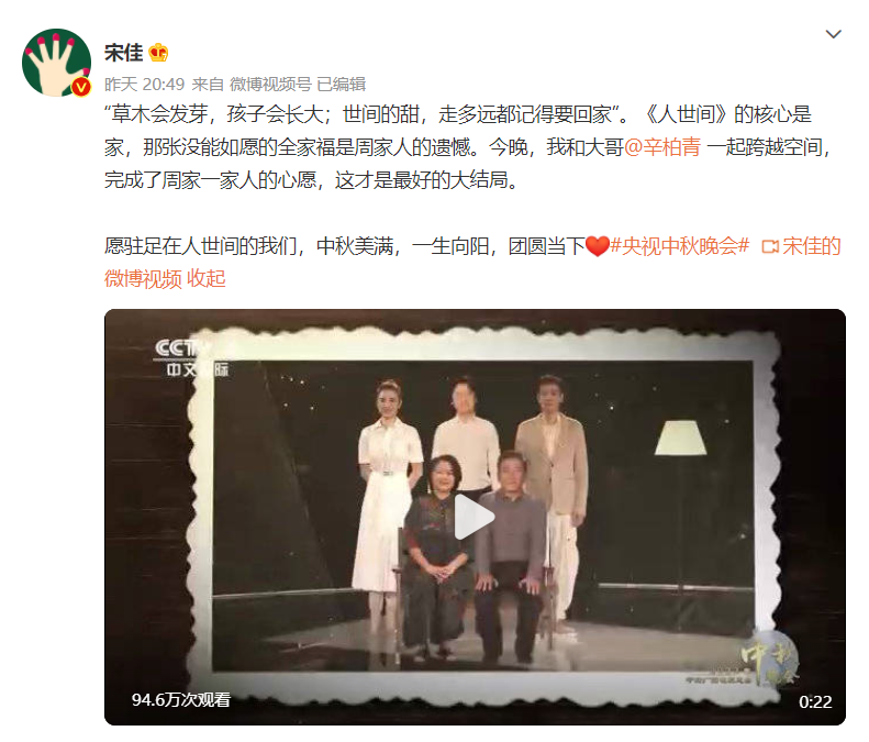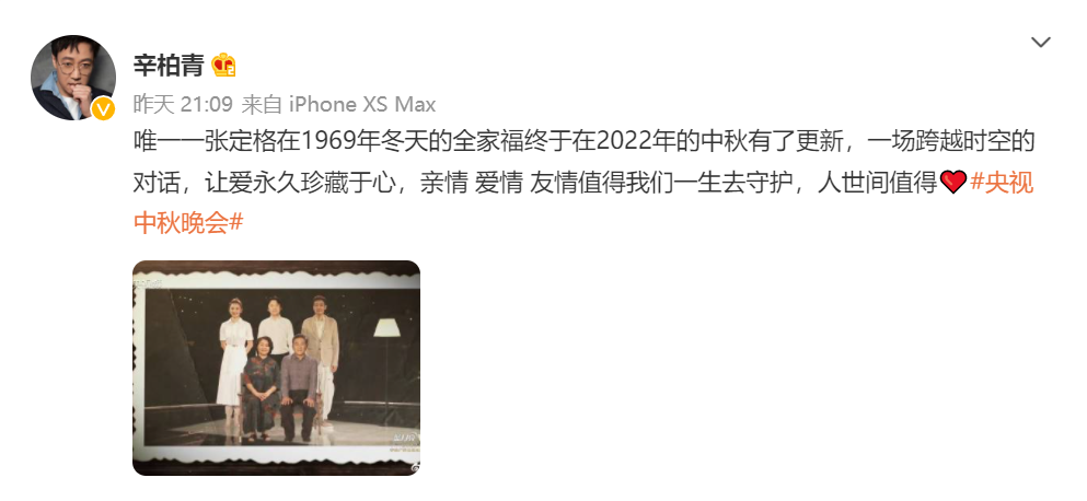 演員辛柏青在秋晚播出後第一時間更新微博這樣寫道:「唯一一張定格在1969年冬天的全家福,終於在2022年中秋有了更新,一場跨越時空的對話讓愛永久珍藏於心間,親情、愛情、友情值得我們用一生去守護。」