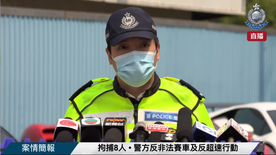 港島總區交通部執行及管制組署理總督察林偉立指,今早約7時發現這批私家車在黃竹坑道向深水灣方向高速行駛,期間無視路面標記,越過雙白線,不顧其他道路使用者安全。當中,有兩輛私家車掛「T牌」,即試車牌照,但有一名司機無法出示授權書及行車紀錄,涉嫌違反試車牌照規定,他亦非車主,未能有合理解釋,連同1名乘客,及其餘6名司機被捕。