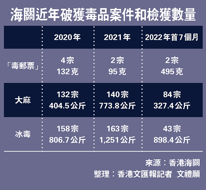 含強烈迷幻藥成分的「毒郵票」幾年前開始大行其道,因為體積小,方便收藏,且不易被警方察覺,引入香港後旋即俘獲一些吸毒年輕人的口味。疫情前不時有毒品「艇仔」流連的夜店是這些違禁品的散貨渠道,經常有毒販向玩得興起的後生仔女「派毒」。