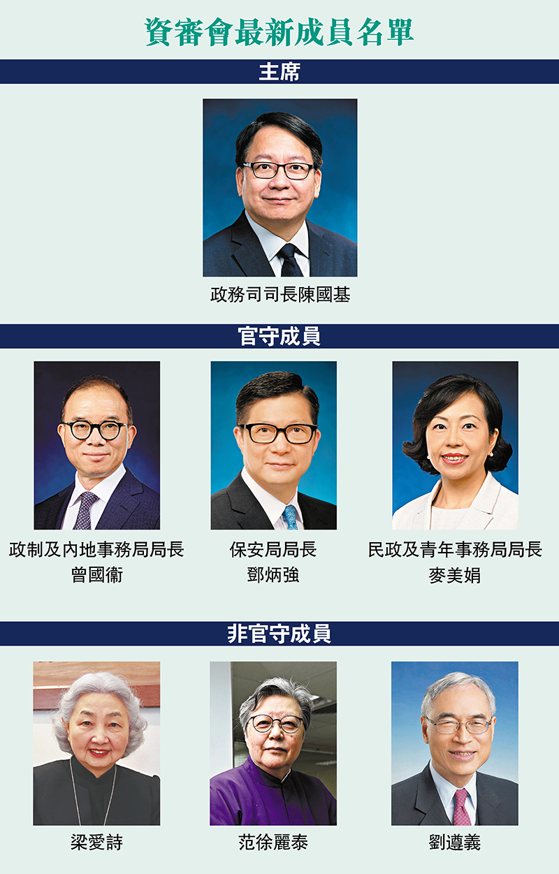 特區行政長官昨日已按《條例》第9A條委任陳國基出任資審會主席,政制及內地事務局局長曾國衞及保安局局長鄧炳強再獲委任,而民政及青年事務局局長麥美娟代替現任文化體育及旅遊局局長楊潤雄出任官守成員。財政司司長陳茂波在上述任命生效時即不再擔任資審會主席。3名非官守成員則繼續獲得委任。