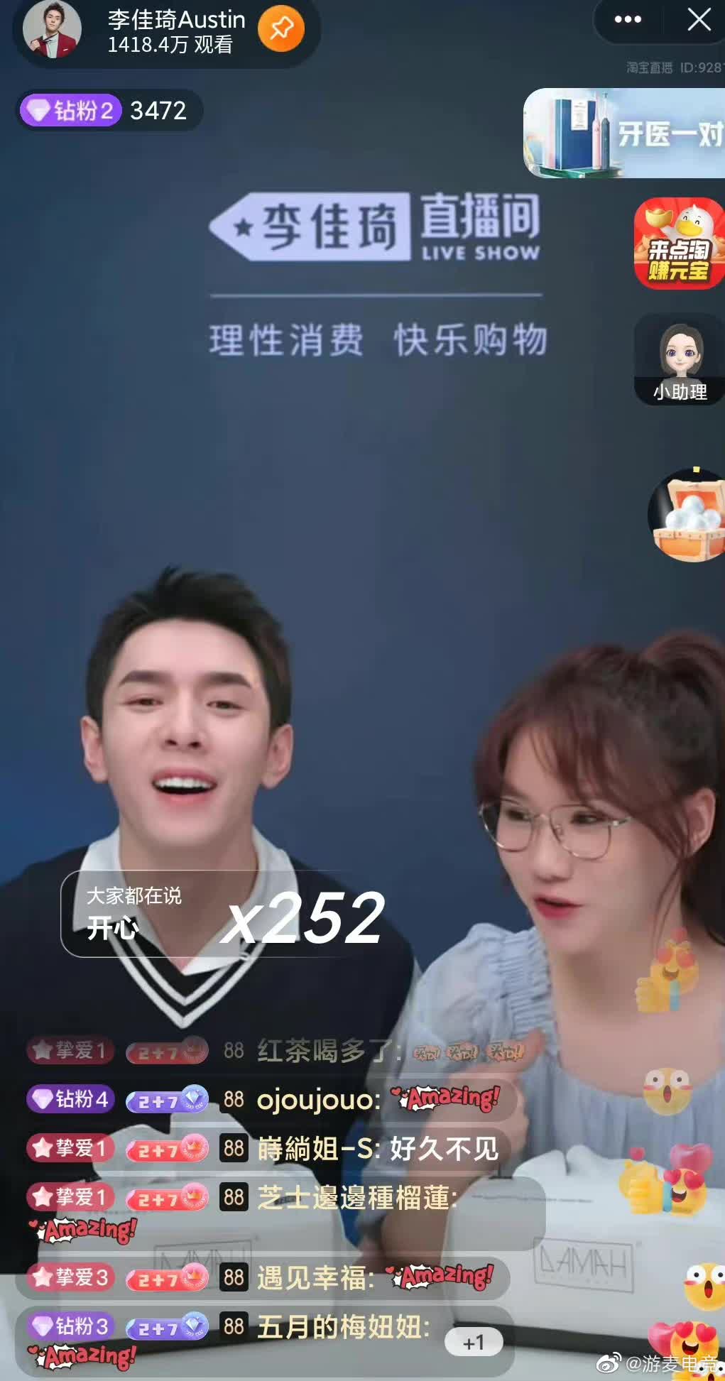大公文匯全媒體報道:今日(20日)晚上7時,停播3個月後,內地人氣電商主播李佳琦在淘寶直播間復播,10分鐘場觀看人數破300萬。在評論中不少粉絲打出了「好久不見」和「啊啊啊啊」表達了對他的思念。