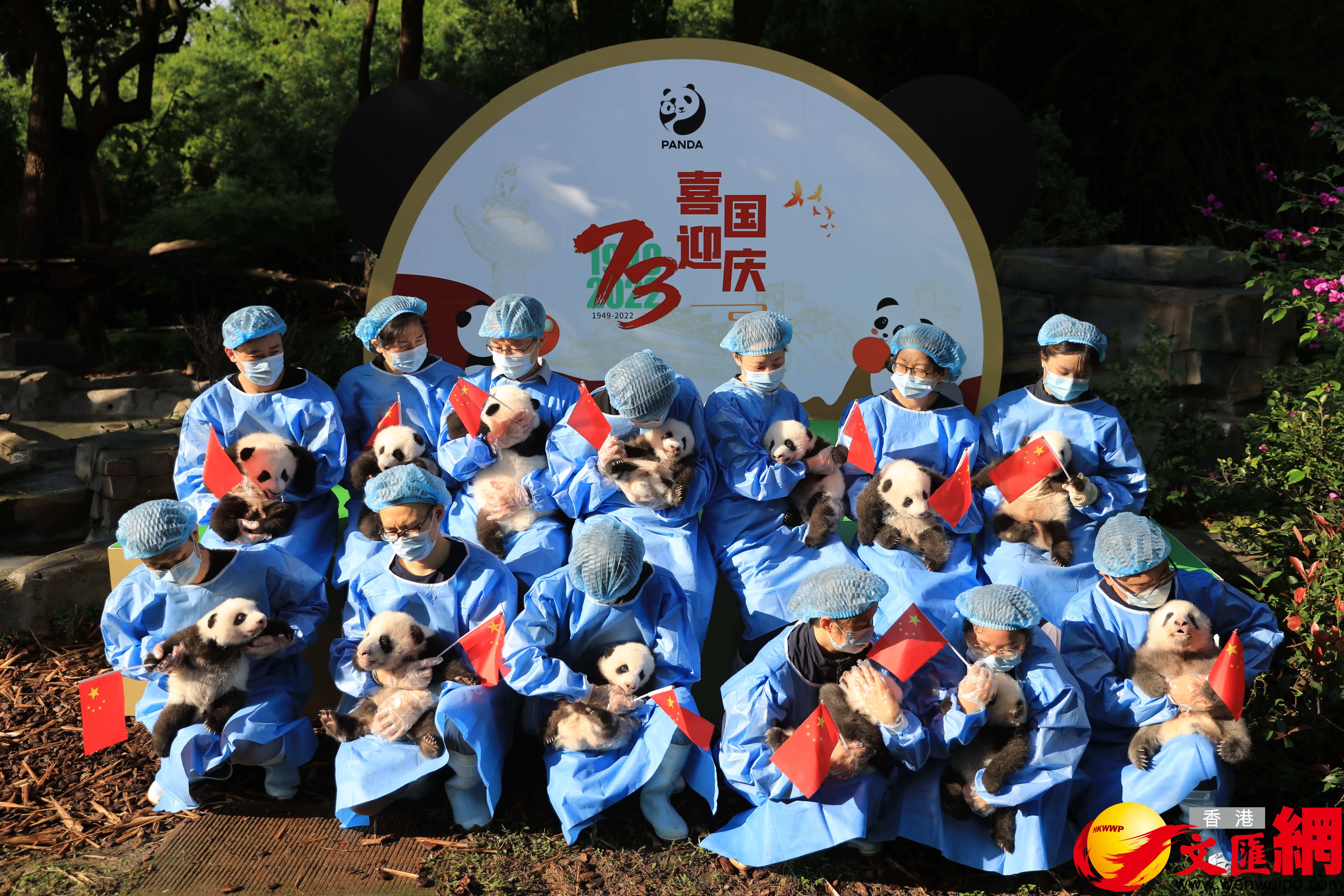 活動現場,飼養員抱着熊貓寶寶們列隊出場,搖動着五星紅旗祝大家國慶節快樂。隨後,大熊貓寶寶們依次被放到了亮相台上,並被擺成「73」的字樣,用這樣獨特的方式慶祝新中國成立73周年。