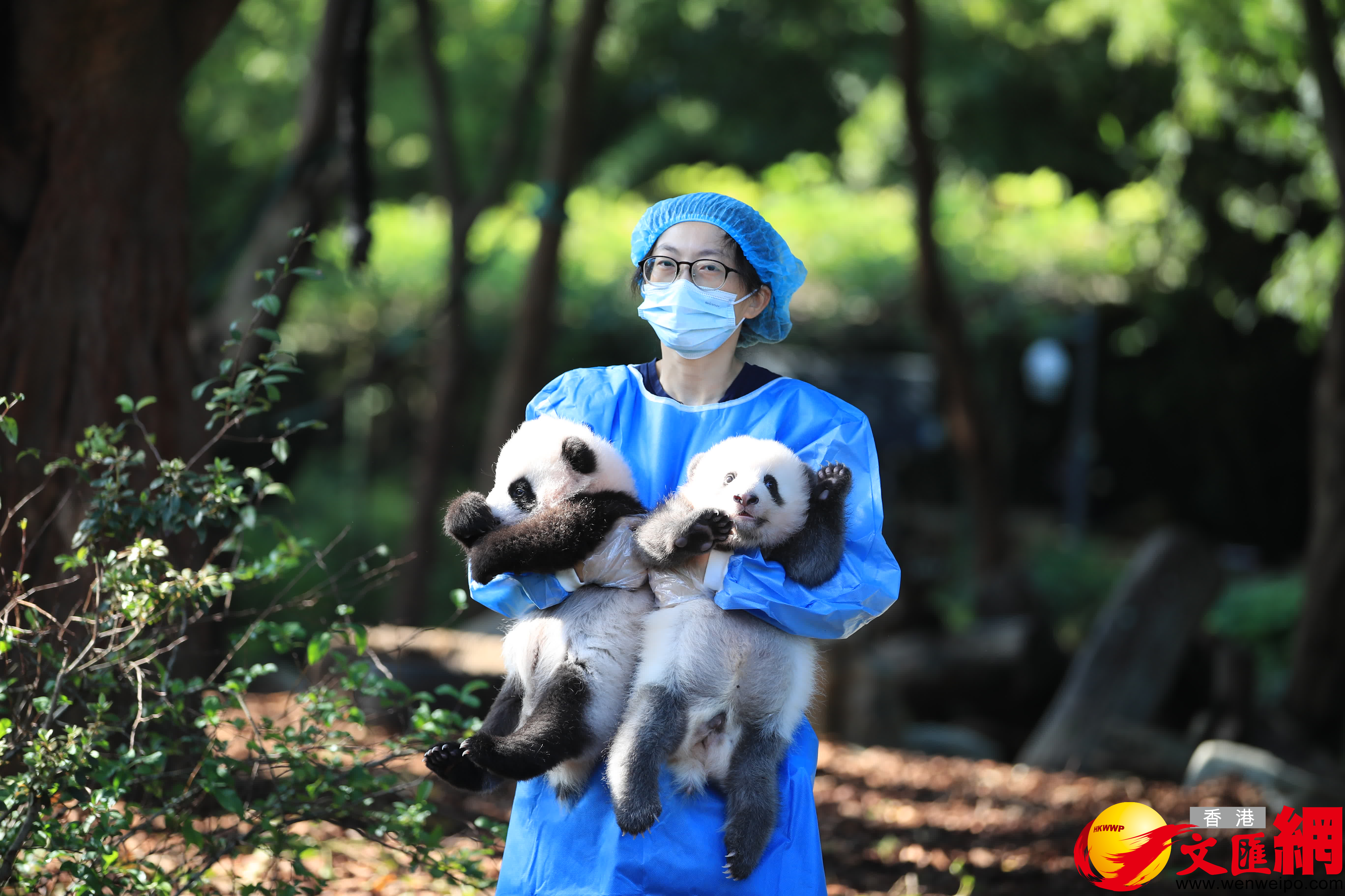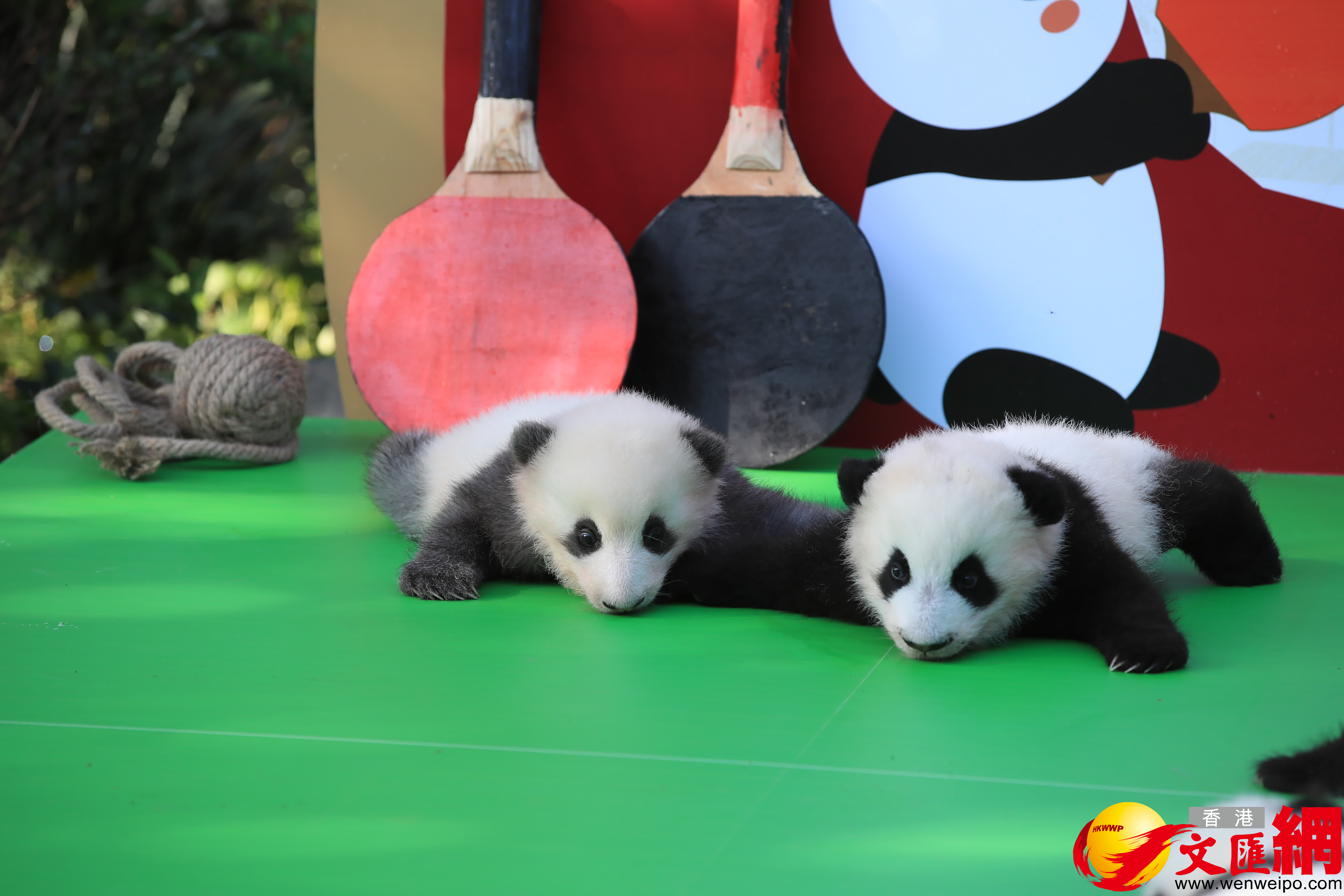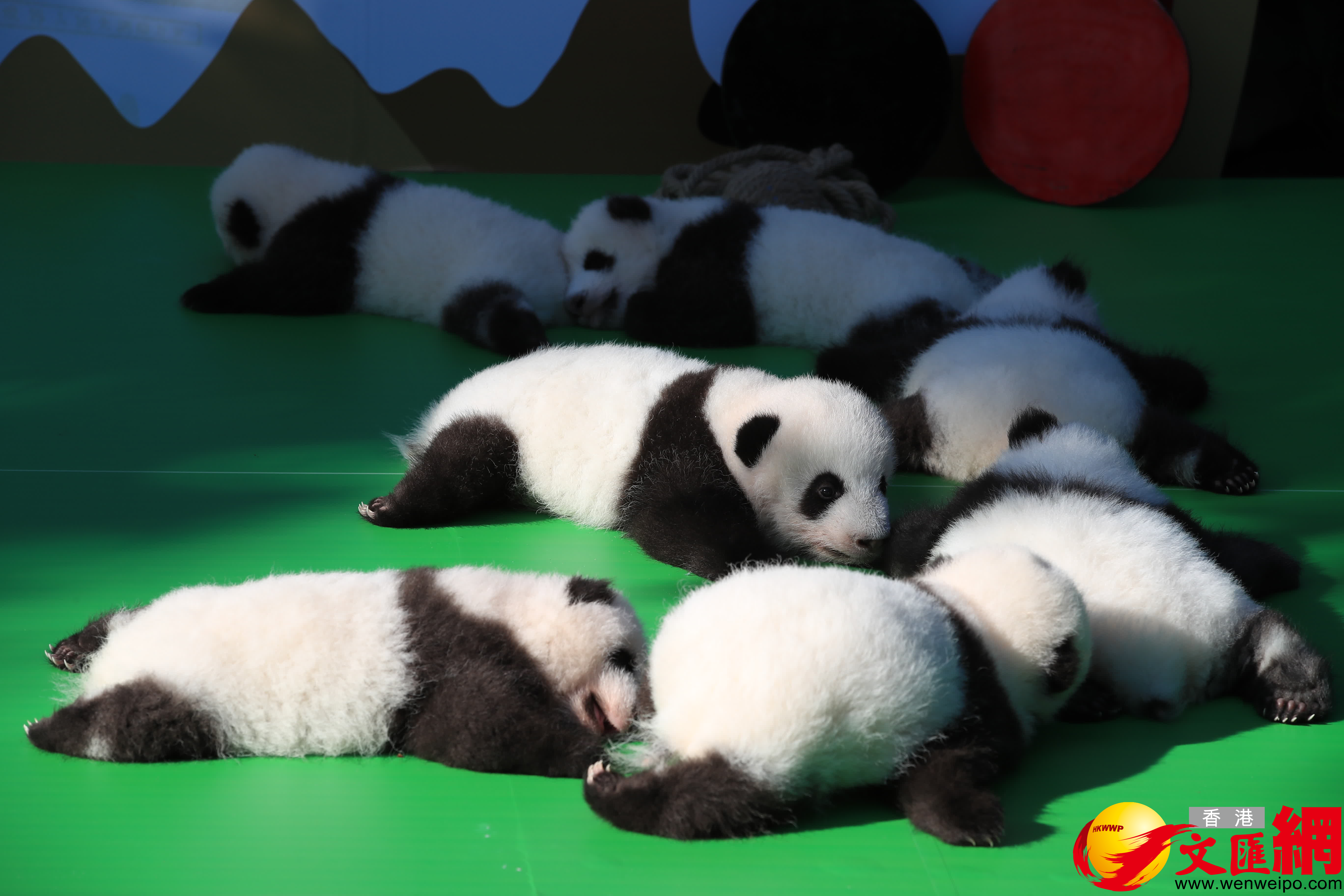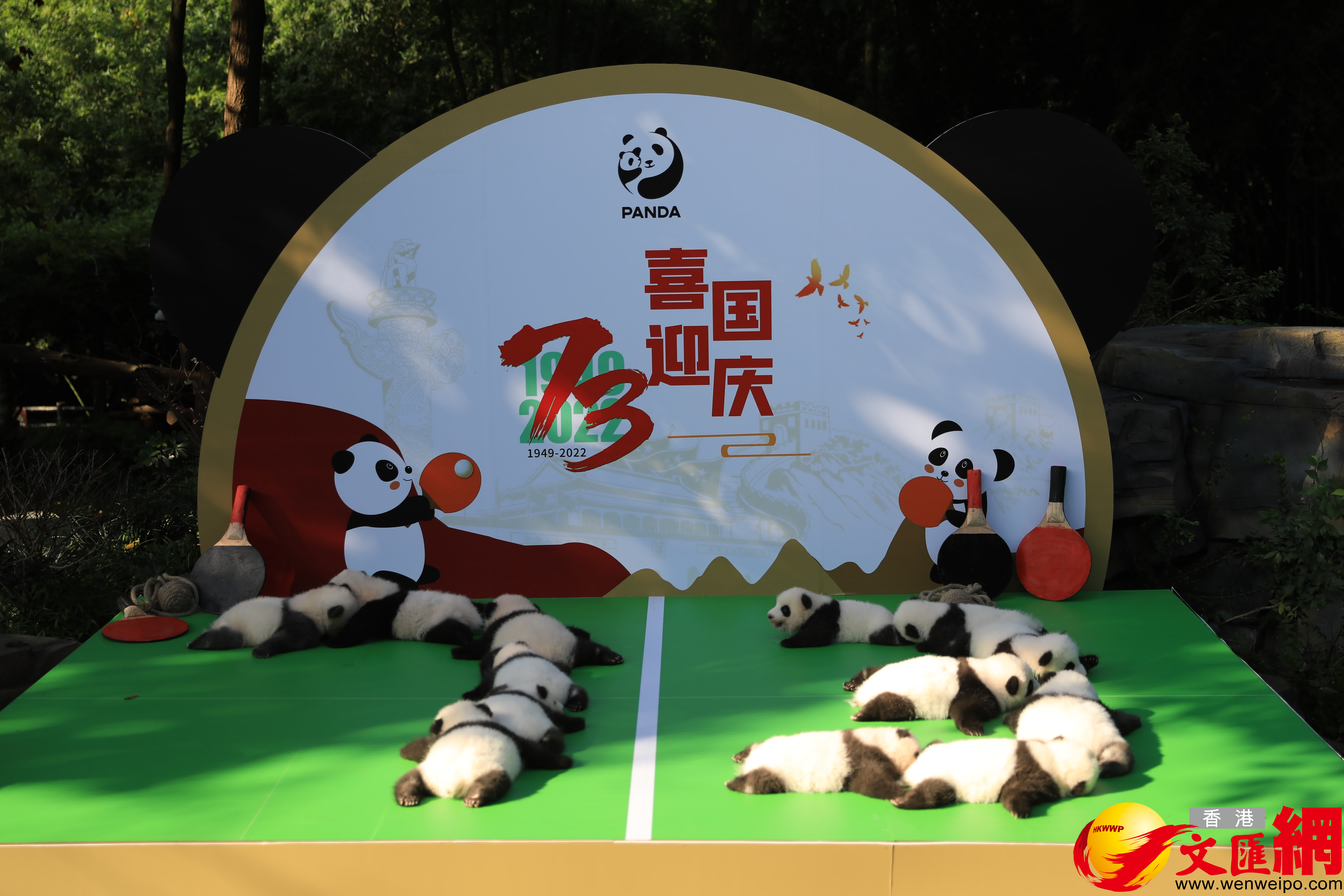 (香港文匯網記者 向芸)28日,成都大熊貓繁育研究基地2022級新生大熊貓寶寶在太陽產房齊齊亮相。「國寶」大熊貓與國慶、「國球」乒乓球元素相結合,展示了成都熊貓基地科研繁育成果。