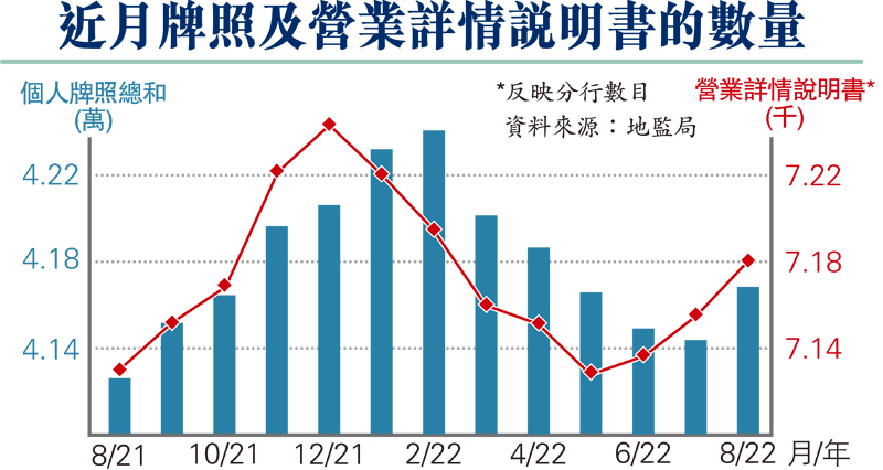 事實上,疫情重創百業下,不少人都會轉行加入地產代理行列。根據地產代理監管局數據顯示,本港地產代理人數於今年2月升至42,408人新高後,連跌5個月,至8月底終止五連跌,最新報41,684人,按月多247人或回升0.6%。不過,據代理統計,同期整體物業註冊量約為5,200宗,以此計算,8月份平均每8名地產代理爭一張單。而反映分行數目的營業詳情說明書,最新錄7,181份,較7月增加25份。布少明認為,由於樓市已轉弱數個月,不少地產代理從業員已陸續轉行,相信未來一段日子,無論是地產代理人數抑或是分行數目都會回落。