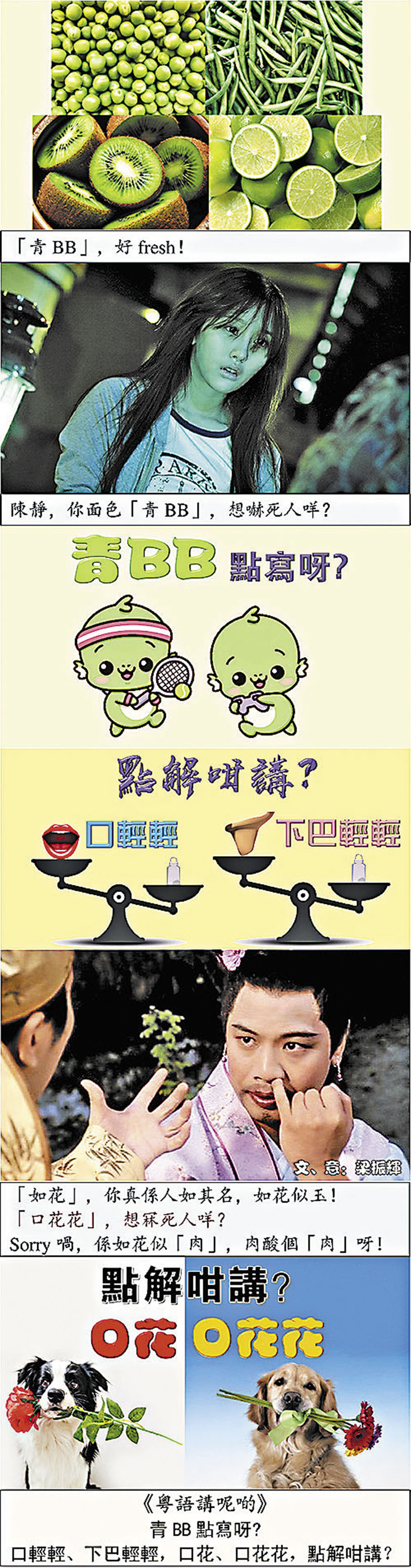 一講到「正寫」,啲人就會去搵啲古書,睇下有咩疊詞係用嚟形容青色嘅;有唔知邊位粵語專家就喺元代關漢卿《雙赴夢》裏頭,搵到個「青鴉鴉」,就認定「鴉鴉」係BB嘅「本字」,呢個講法跟住就喺網上流傳。冇錯「青BB」係有「青鴉鴉」嘅意思,但係「鴉」個讀音同B嘅讀音,好似「大纜都扯唔埋」喎!筆者一直強調,「本字」一定要夾「音」同「義」,是但一樣接近,都唔可以構成作為「本字」嘅理據。根據筆者嘅考究,「青BB」係由「青碧碧」音變過嚟:「青」係「淺綠」,適當嘅形容詞係「碧綠」;廣東人就聯想到「碧碧」呢個疊詞,於是就創作咗「青碧碧」;講下講下,咪講咗做「青BB」囉!雖然「正寫」已經搵到,筆者建議寫嗰陣都係寫做最簡單嘅「青BB」,香港人中英夾雜係冇問題嘅!